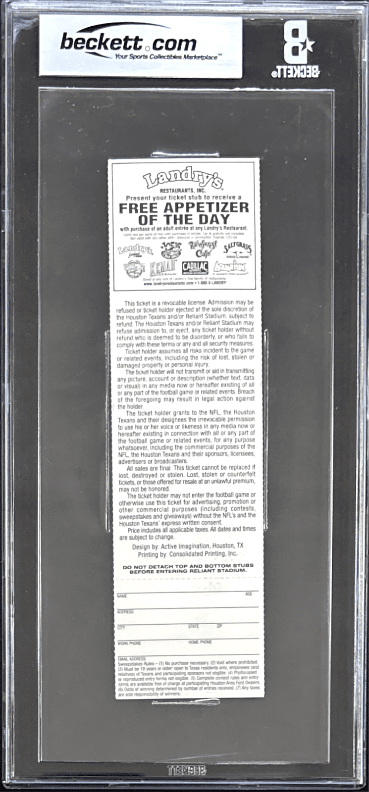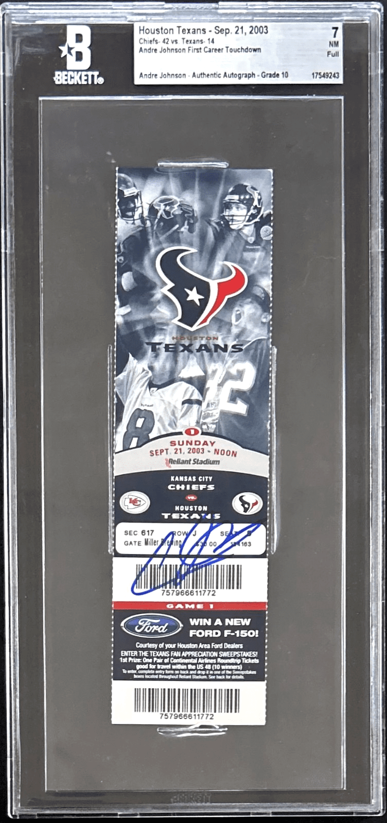 You are bidding on a autographed ticket signed by Andre Johnson. This is a Full Ticket is from the Houston Texans vs Kansas City Chiefs game that was held on September 21, 2003. In this game Andre Johnson scored his first career touchdown.