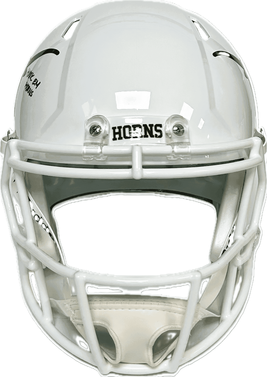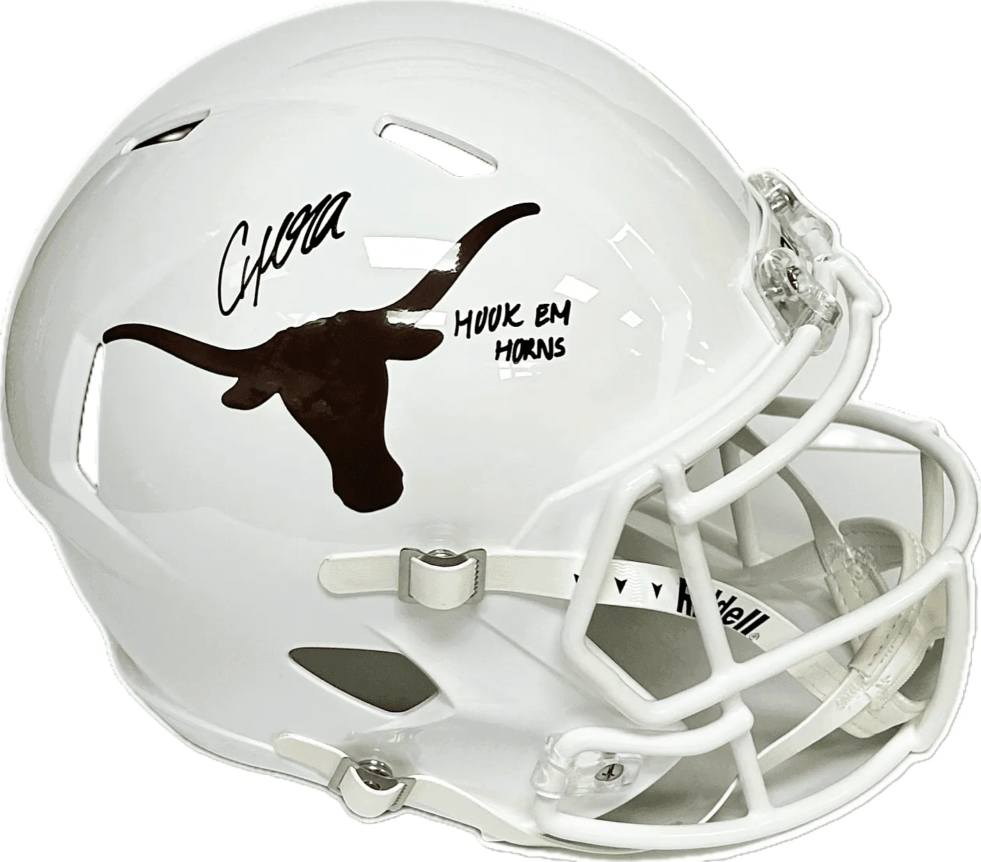 is a hand autographed helmet signed by the above mentioned player. This item comes with the inscription: Hook Em Horns. This is a Riddell Replica Full Size Football Helmet. This item has JSA
