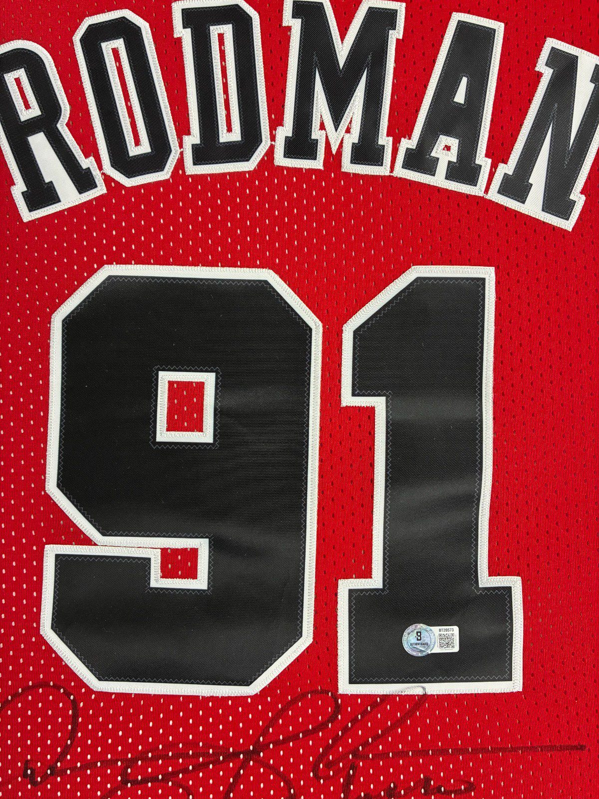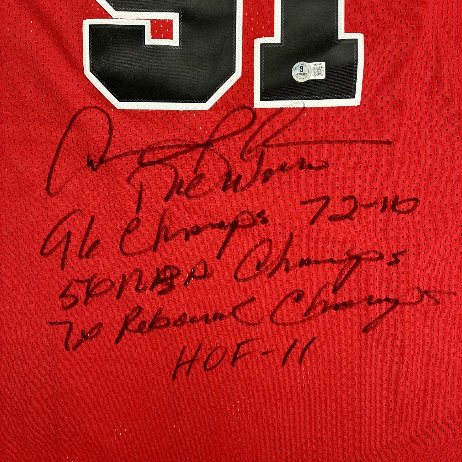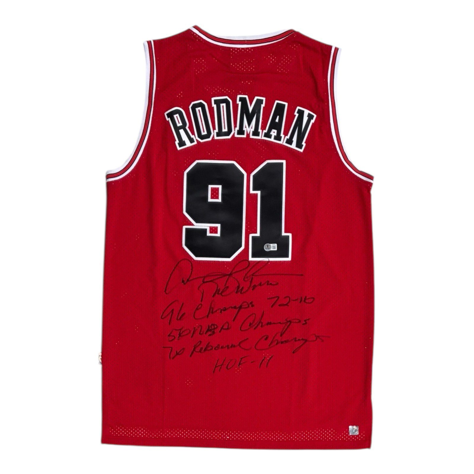 This is a hand autographed jersey signed by the person listed above. This item comes with the following inscriptions: The Worm, 96 Champs 72-10, 5x NBA Champs, 7x Rebound Champ & HOF-11. This jersey is an authentic style jersey with all stitched letters and numbers. All jerseys are brand new, never worn. This item has a Beckett Authentication tamper proof sticker attached to the item. You can view this items authentication on the Beckett website. This item also comes with a Dennis Rodman Exclusive Player Hologram. All of our autographs are 100% Authentic.