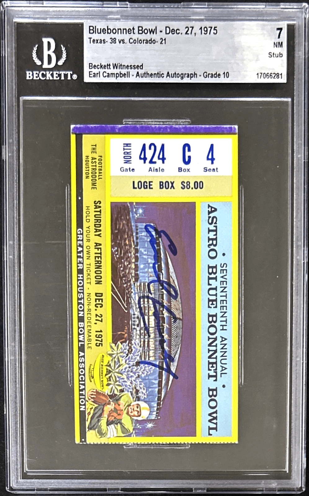 You are purchasing an autographed ticket signed by Earl Campbell. This ticket is from the Texas Longhorns vs Colorado game. This game was played on December 27, 1977.