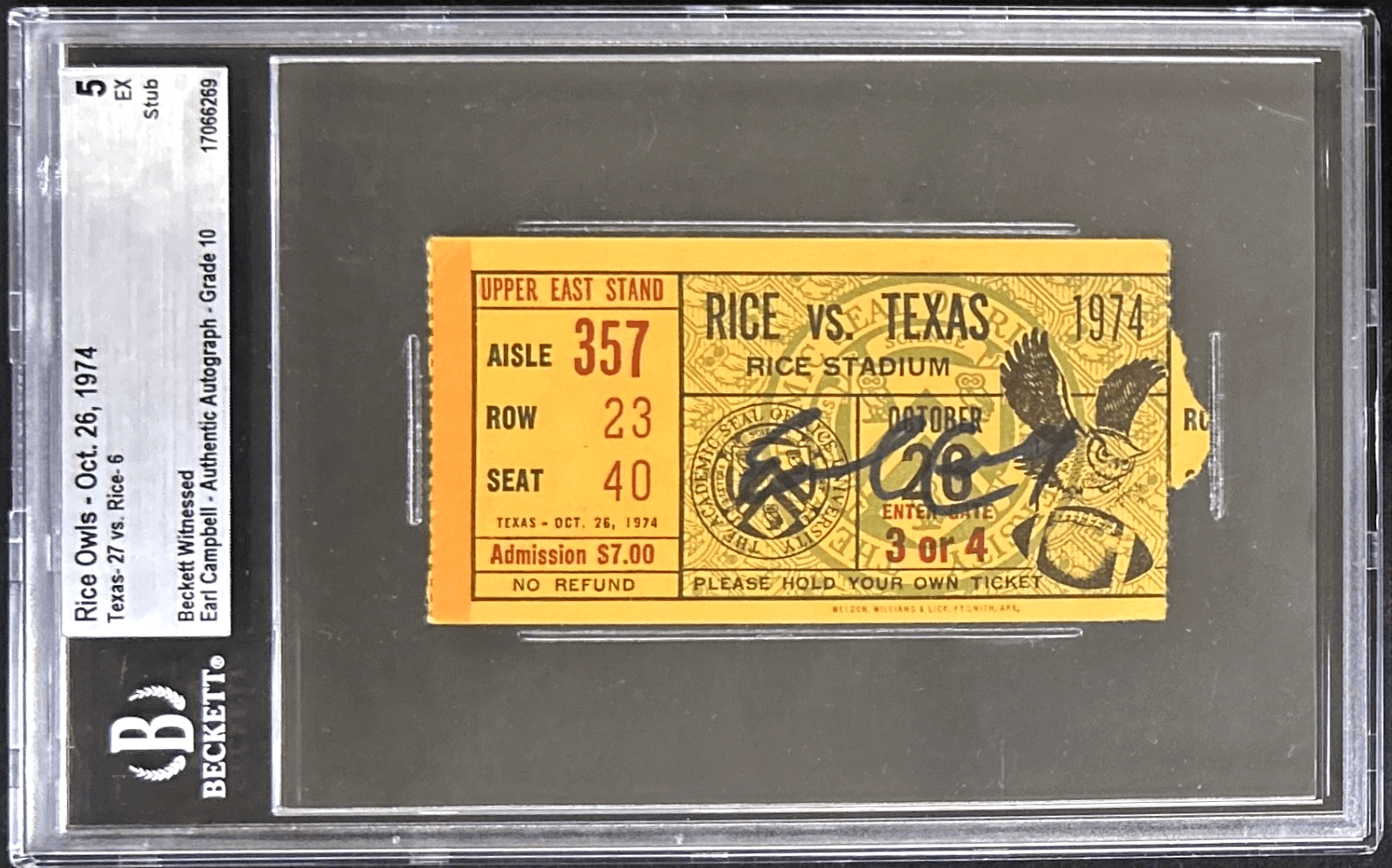 You are purchasing an autographed ticket signed by Earl Campbell. This ticket is from the Texas Longhorns vs Rice game. This game was played on October 26, 1974.
