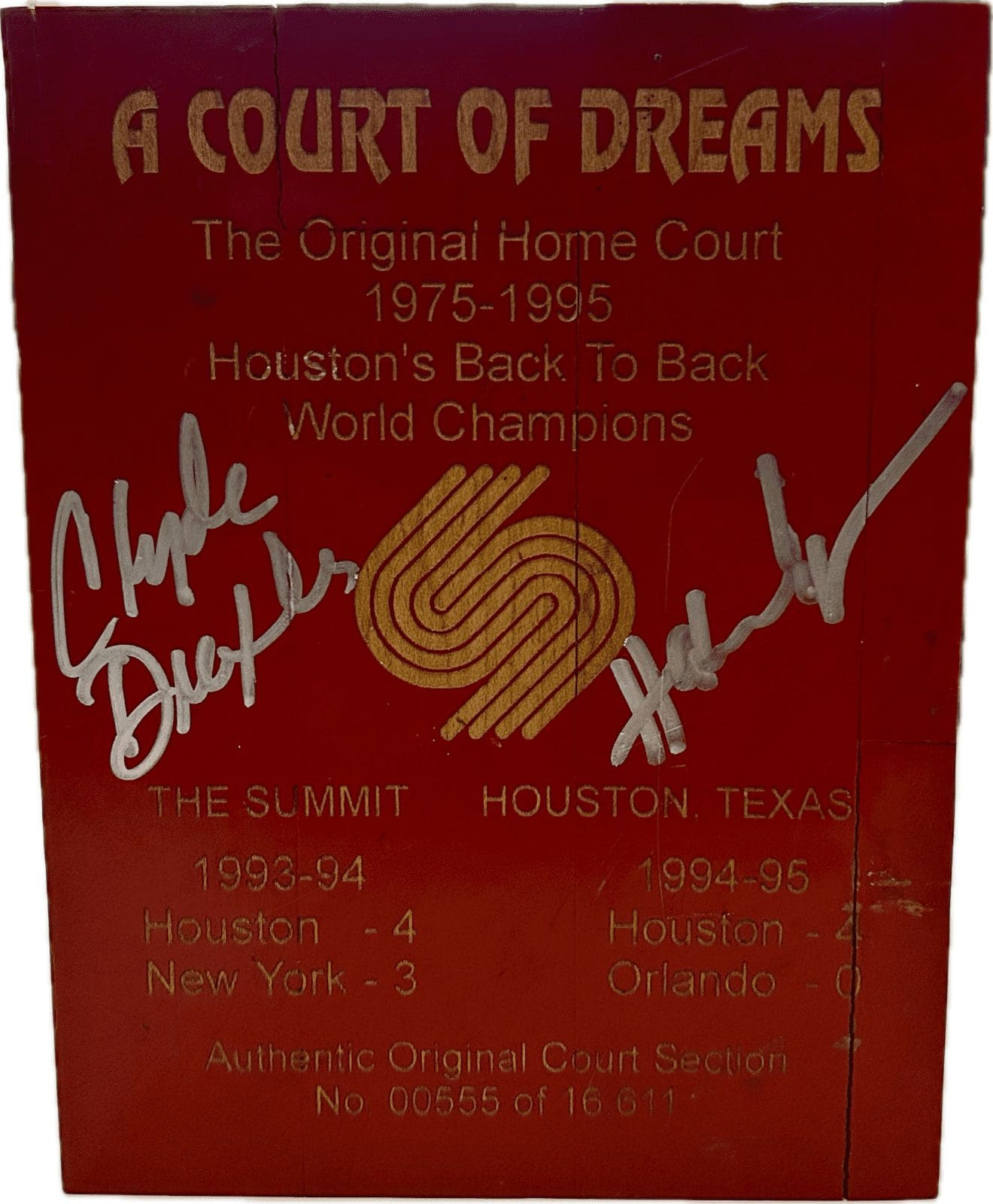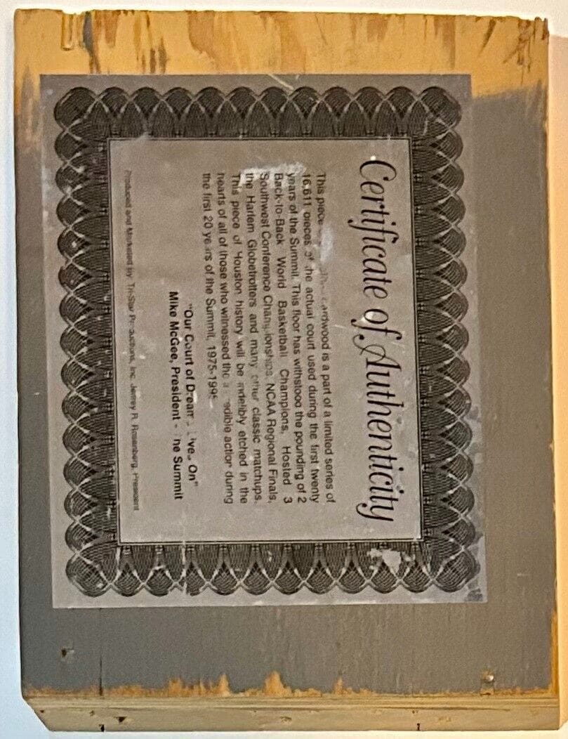 is a hand autographed original signed by the persons listed above. This is original piece of the court of The Summit which was home of the Houston Rockets. This court was used from 1975-1995 and this piece is number 555 of the set. This item has a JSA authentication sticker, which comes with a JSA #’d tamper proof sticker attached to the item and comes with the matching JSA card. All of our items are signed either at a public autograph appearance or a private signing. All of our autographs are 100% Authentic.