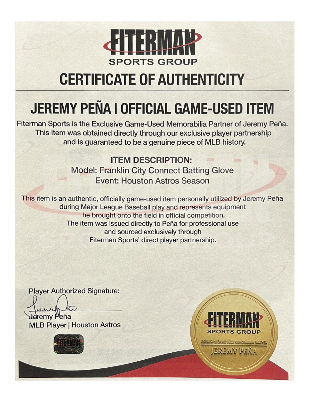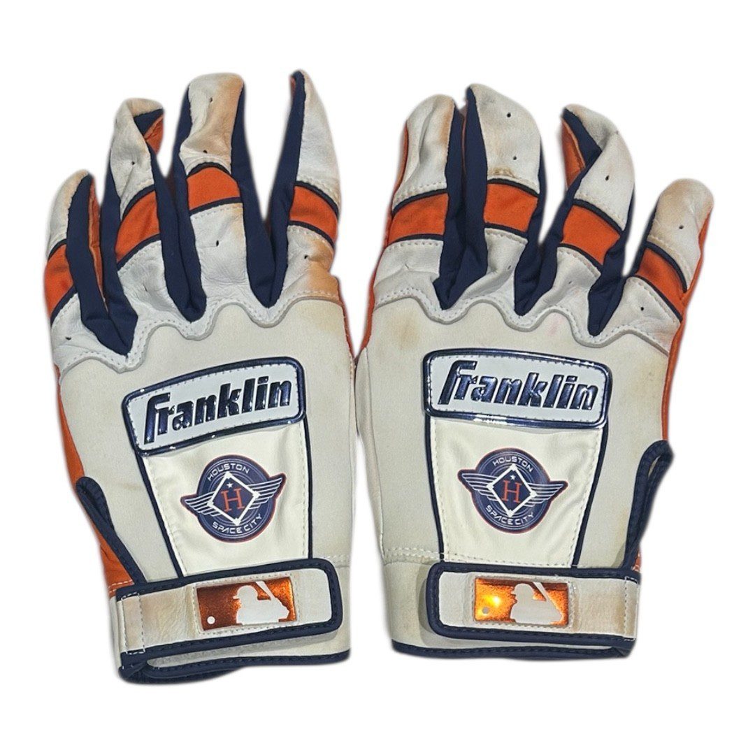 These are game used batting gloves used by Jeremy Pena. These baseball gloves were used by Mr. Pena during a MLB Season game. This item is custom made for Mr. Pena to use the MLB Season.