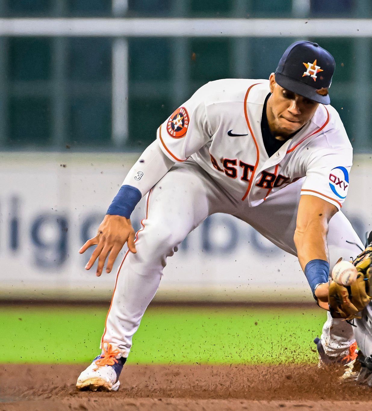 This is a game used arm sleeve used by Jeremy Pena. This arm sleeve was used by Mr. Pena during a MLB Season game. This item is custom made for Mr. Pena to use the MLB Season.
