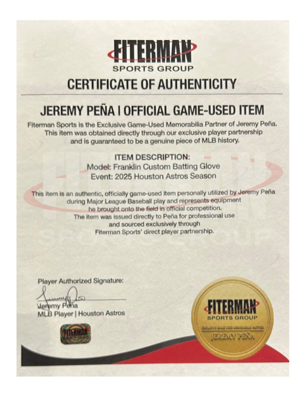 These are game used batting gloves used by Jeremy Pena. These baseball gloves were used by Mr. Pena during a MLB Season game. This item is custom made for Mr. Pena to use the MLB Season.