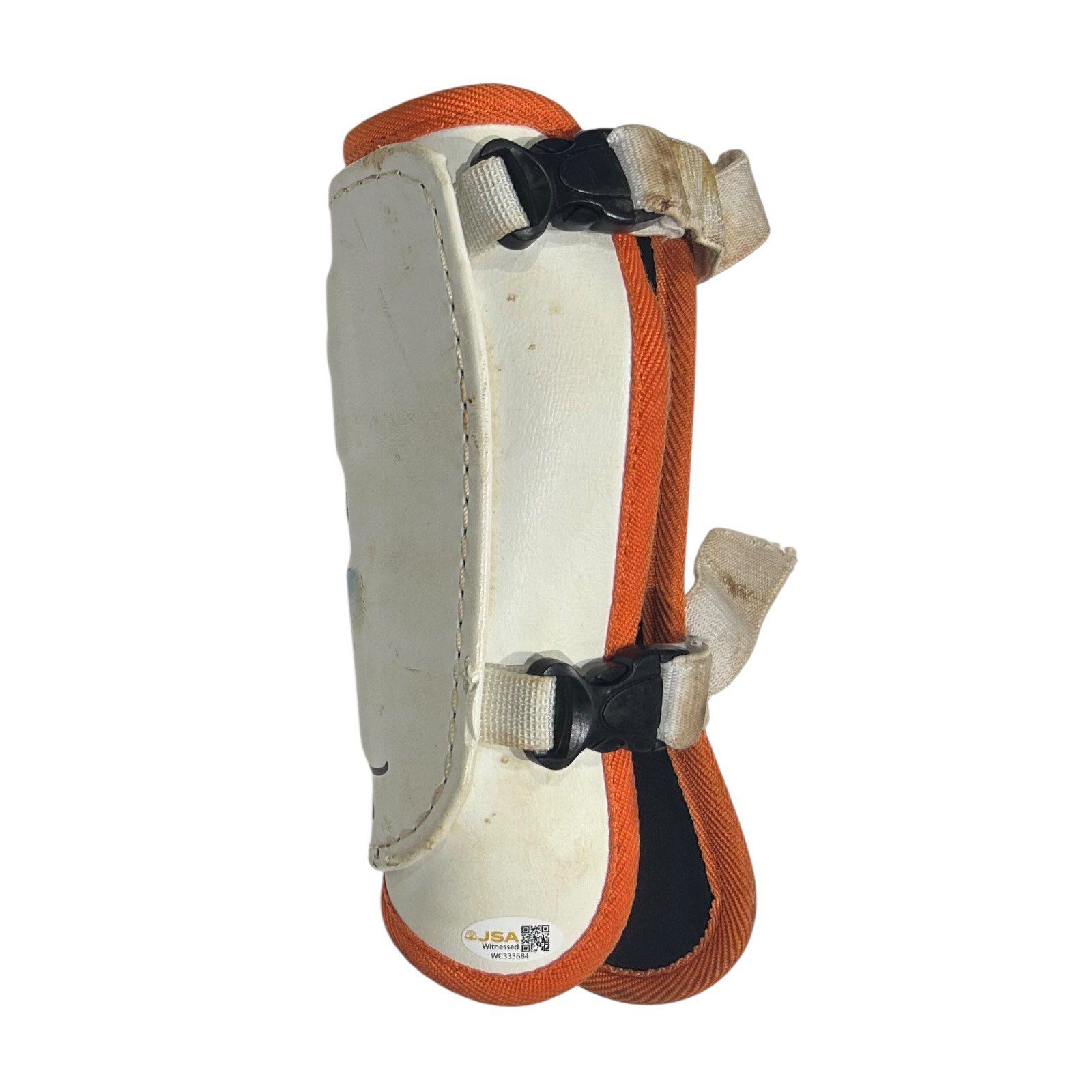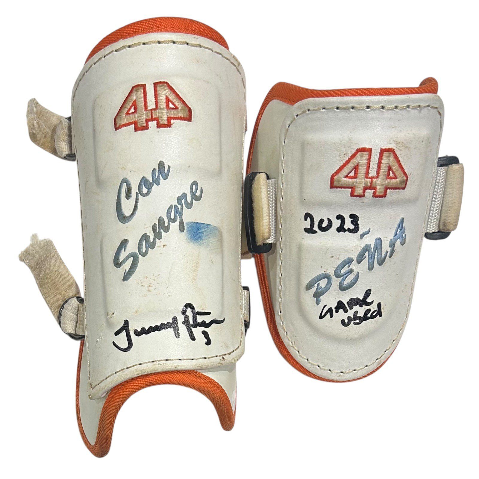 This is a game used elbow pad and shin guard used by Jeremy Pena in 2023. This elbow pad and shin guard was used by Mr. Pena during the 2023 MLB Season. These items are custom made for Mr. Pena. This item comes with the inscription: 2023 Game Used. This item has JSA Authentication sticker, which comes with a JSA tamper proof sticker attached to the item. This items authentication can be viewed on the JSA website.