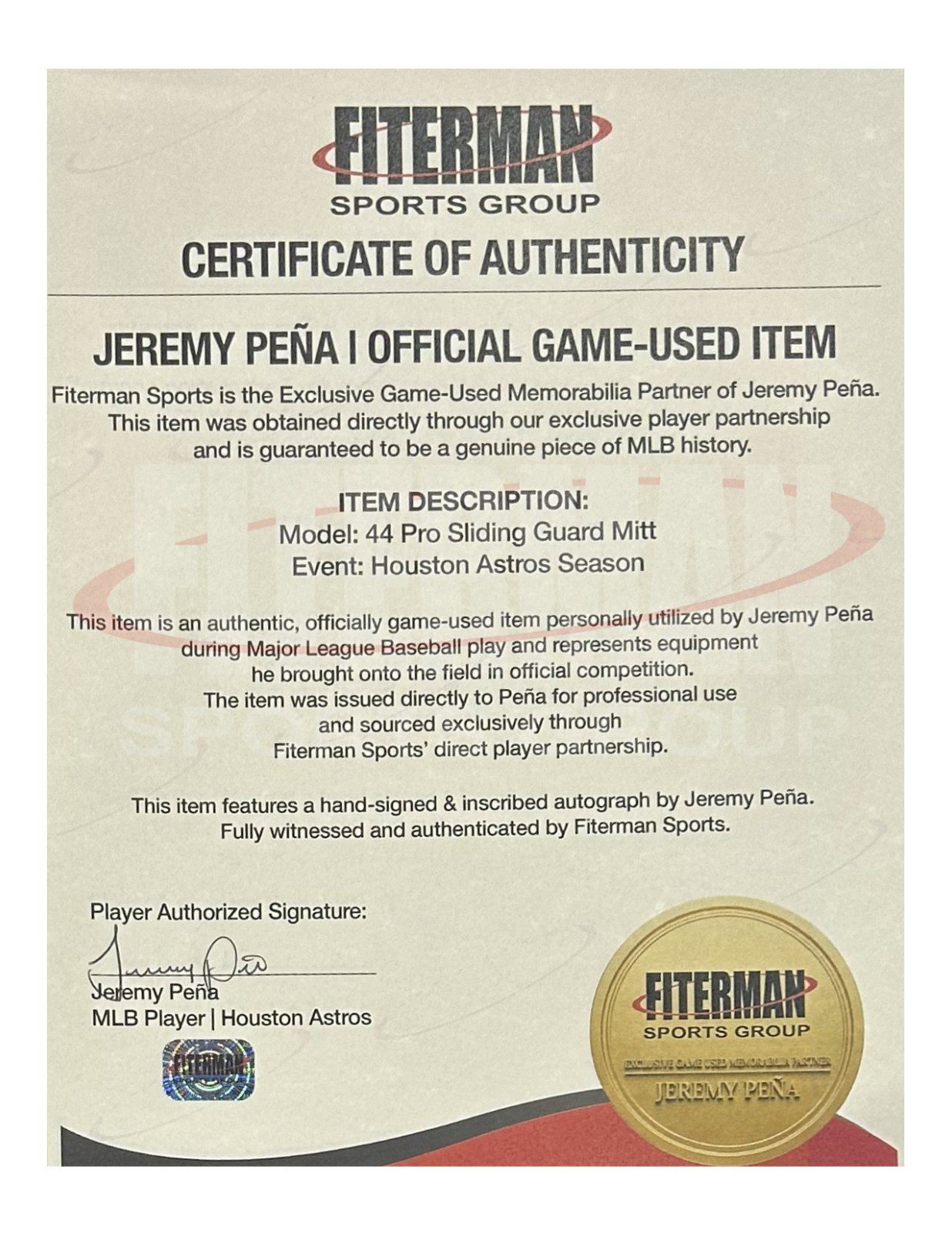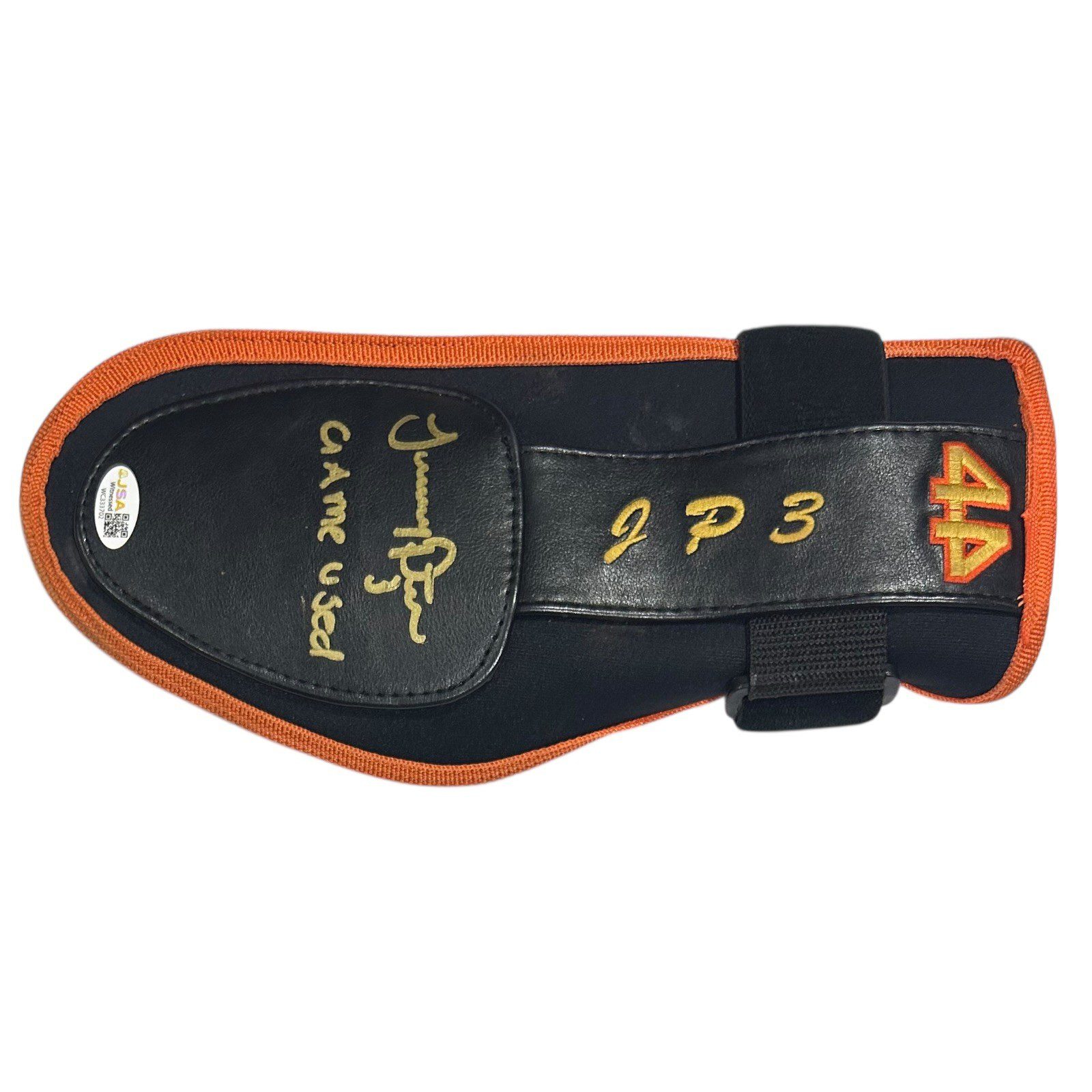 This is a game used sliding guard mitt used by Jeremy Pena in 2023. This sliding guard mitt was used by Mr. Pena during the 2023 MLB Season. This item is custom made for Mr. Pena. This item comes with the inscription: Game Used. This item has JSA Authentication sticker, which comes with a JSA tamper proof sticker attached to the item. This items authentication can be viewed on the JSA website.