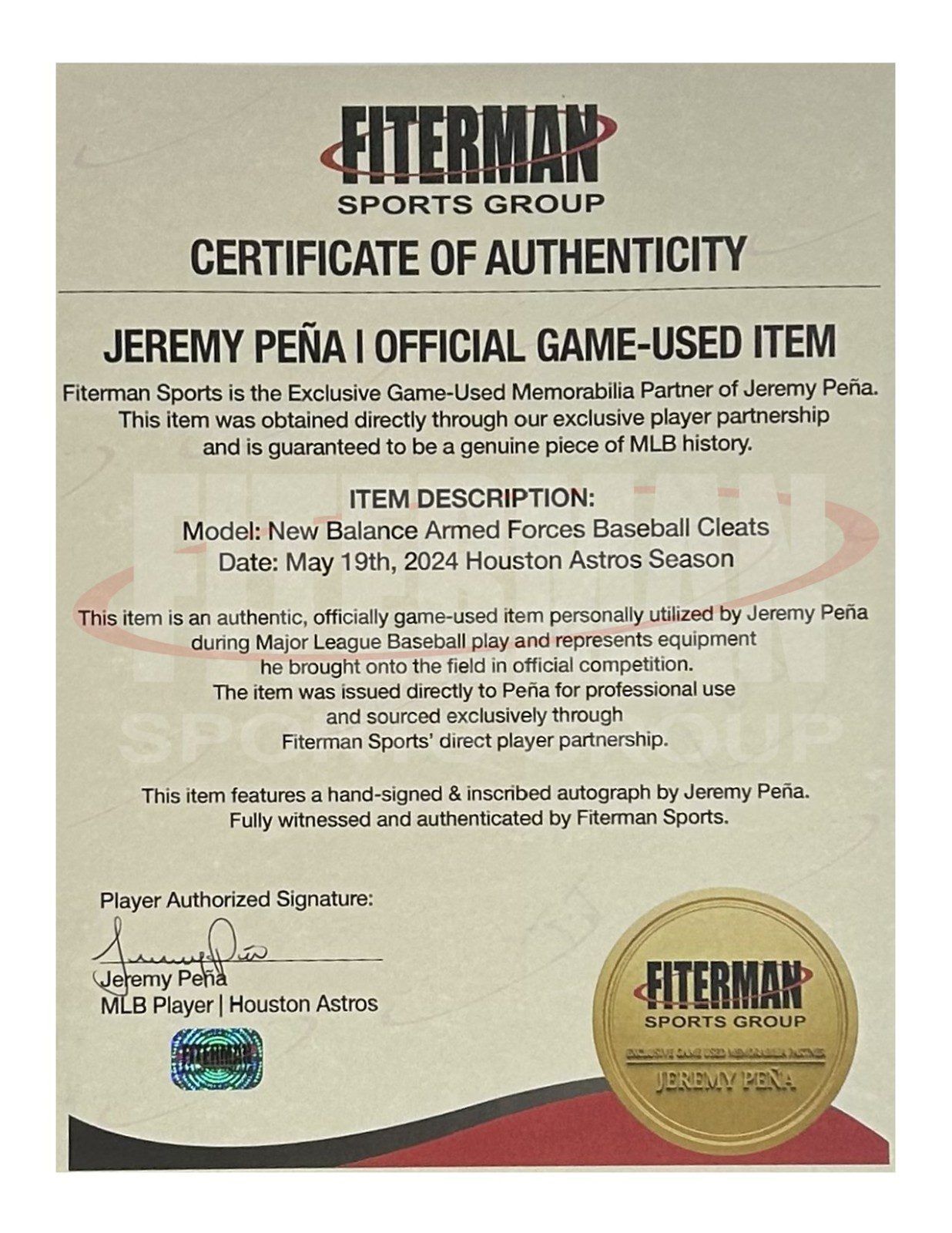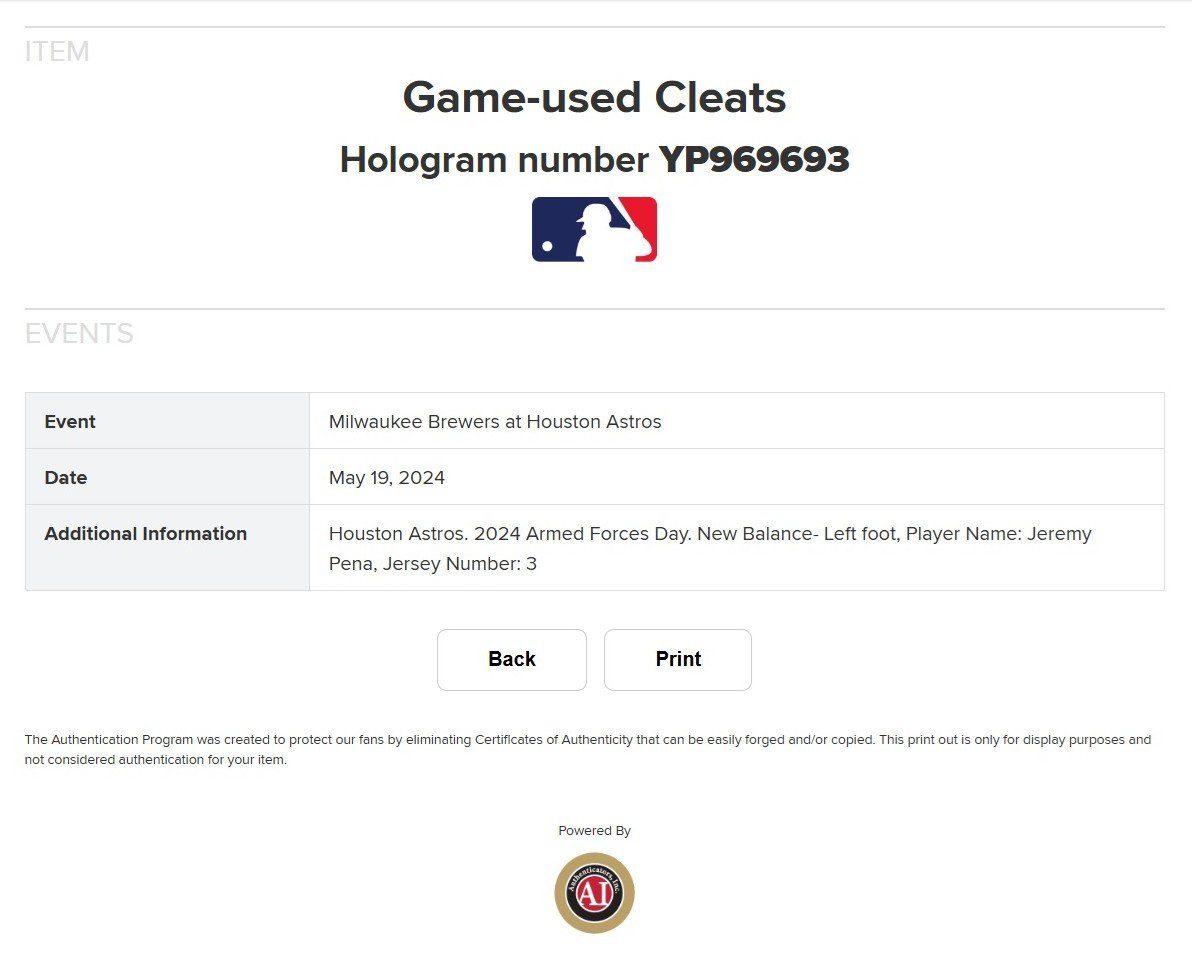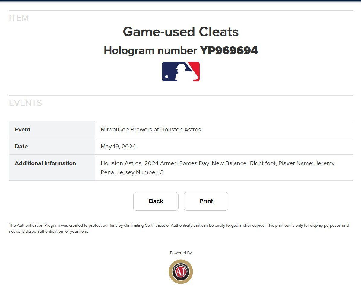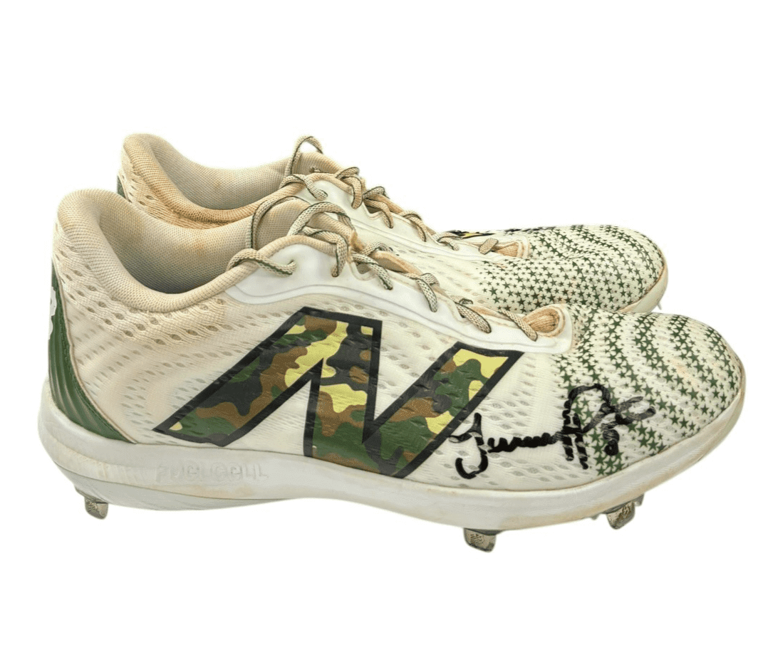 These are game used baseball cleats used by Jeremy Pena in 2024. These baseball cleats were used by Mr. Pena during the 2024 MLB Armed Forces Game on May 19, 2024. This item is custom made for Mr. Pena and are size 11. This item comes with the inscription: Armed Forces Day 2024 GU. This item has JSA Authentication sticker, which comes with a JSA tamper proof sticker attached to the item. This items authentication can be viewed on the JSA website. This item also comes MLB Authenticated. You can view this items authentication on the MLB authentics website.
