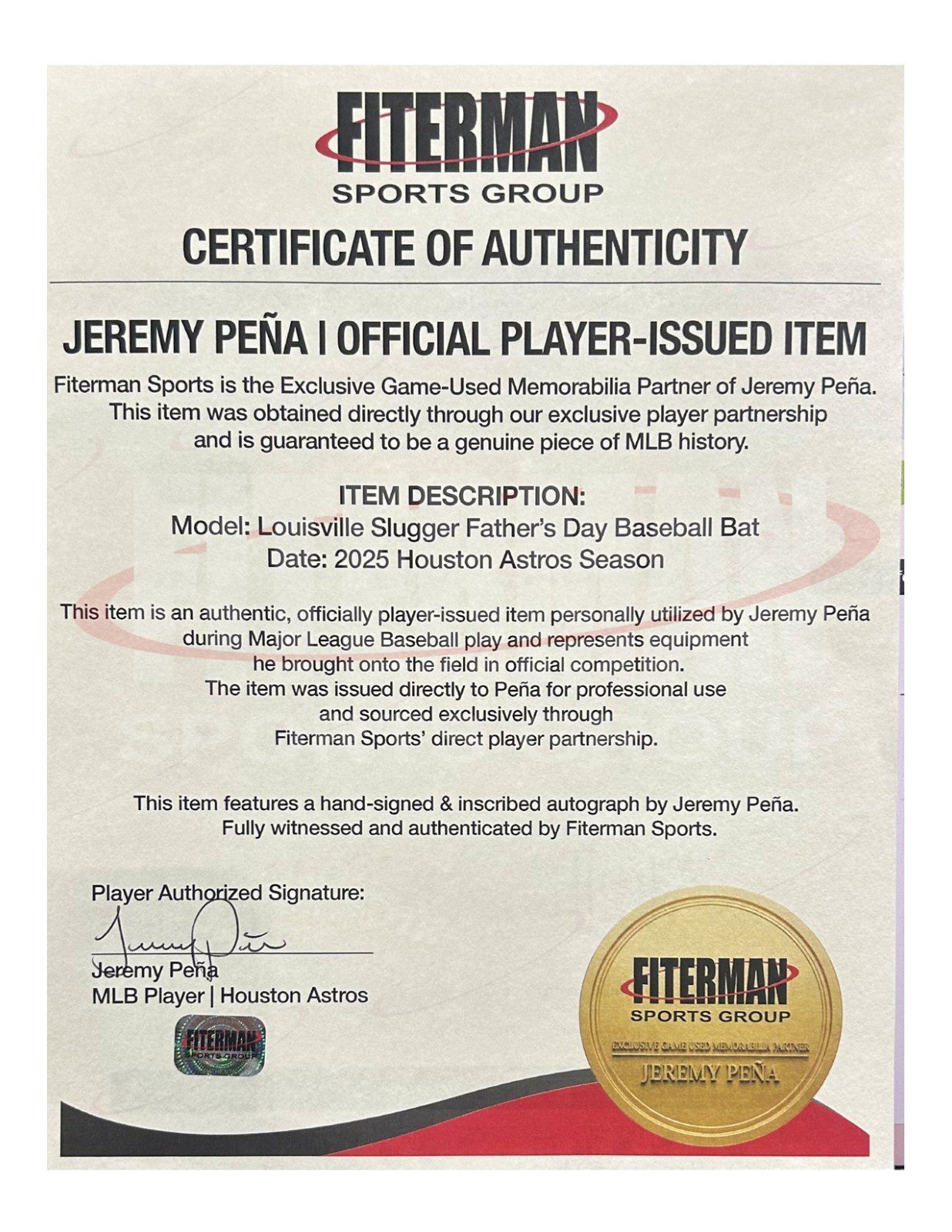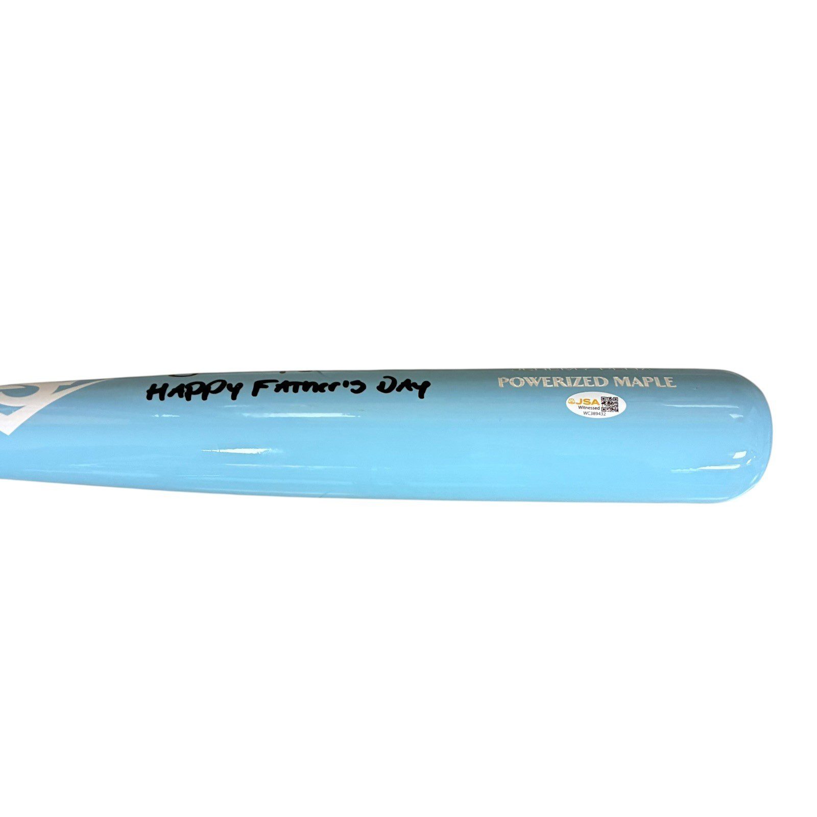 This is a Jeremy Pena player issued bat. This baseball bat was issued to Mr. Pena during the 2025 MLB Father’s Day Game. This item is custom made for Mr. Pena to use during the 2025 MLB Father’s Day Game. This item comes with the inscription: Happy Father’s Day. (THIS BAT IS NOT GAME USED) This item has JSA Authentication sticker, which comes with a JSA tamper proof sticker attached to the item. This items authentication can be viewed on the JSA website.