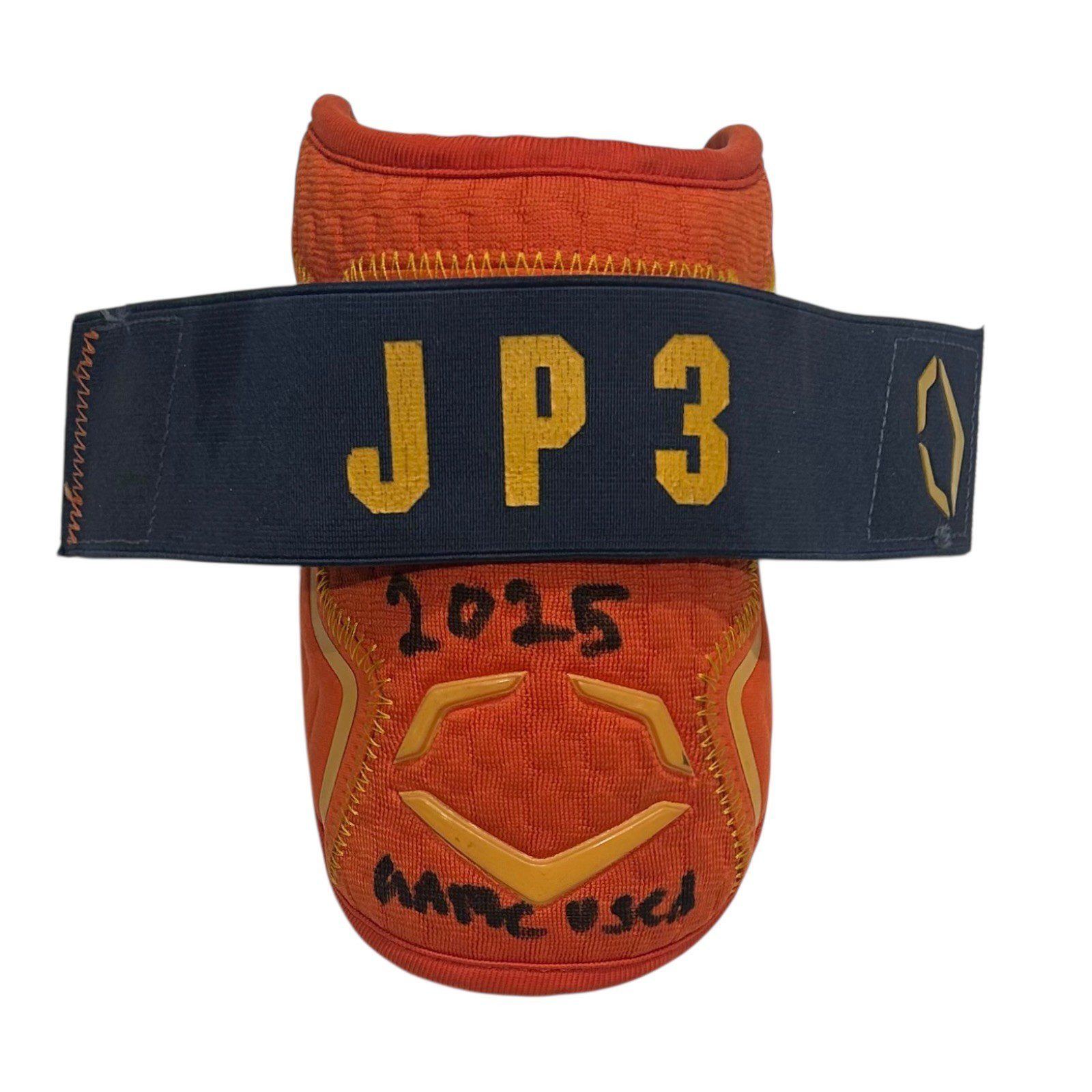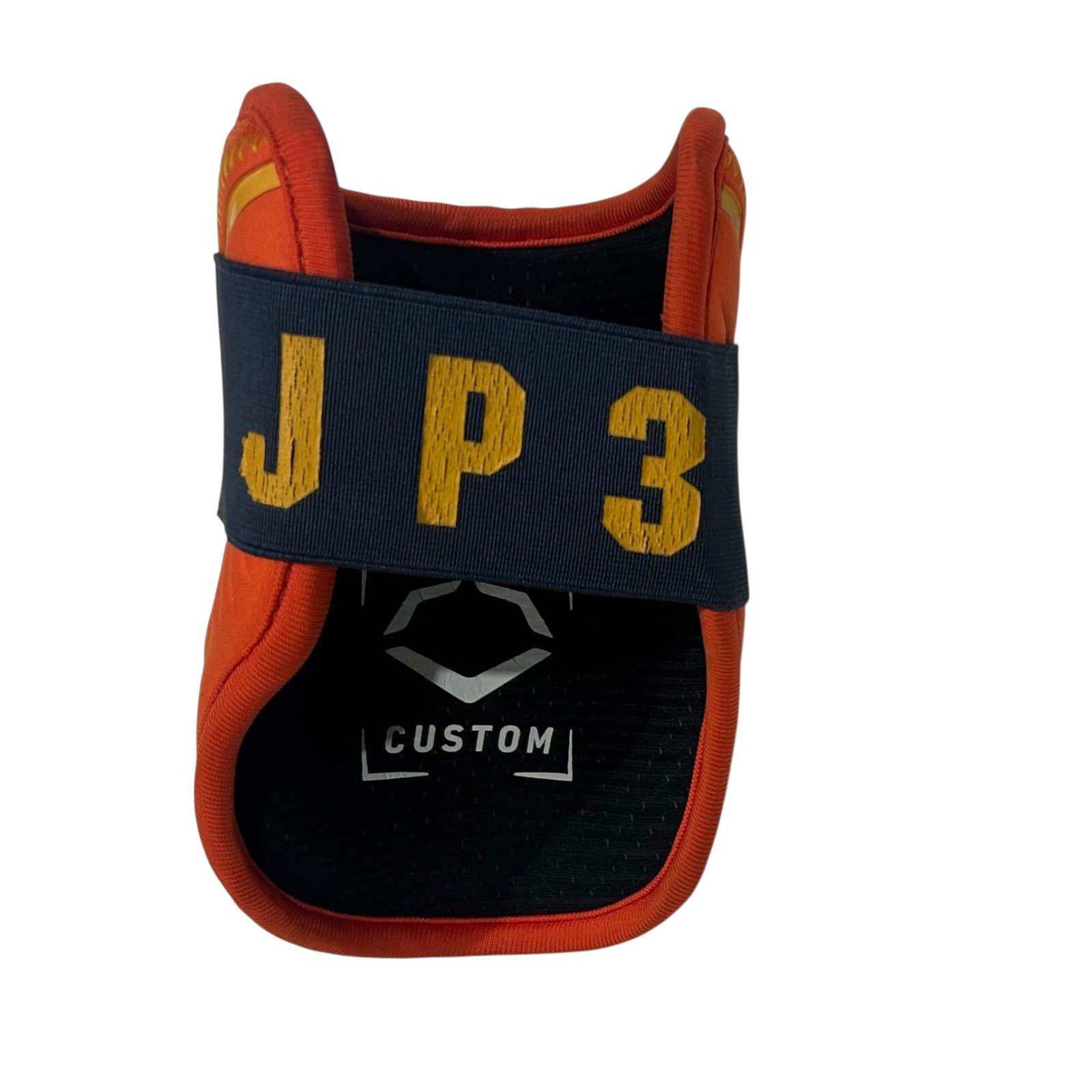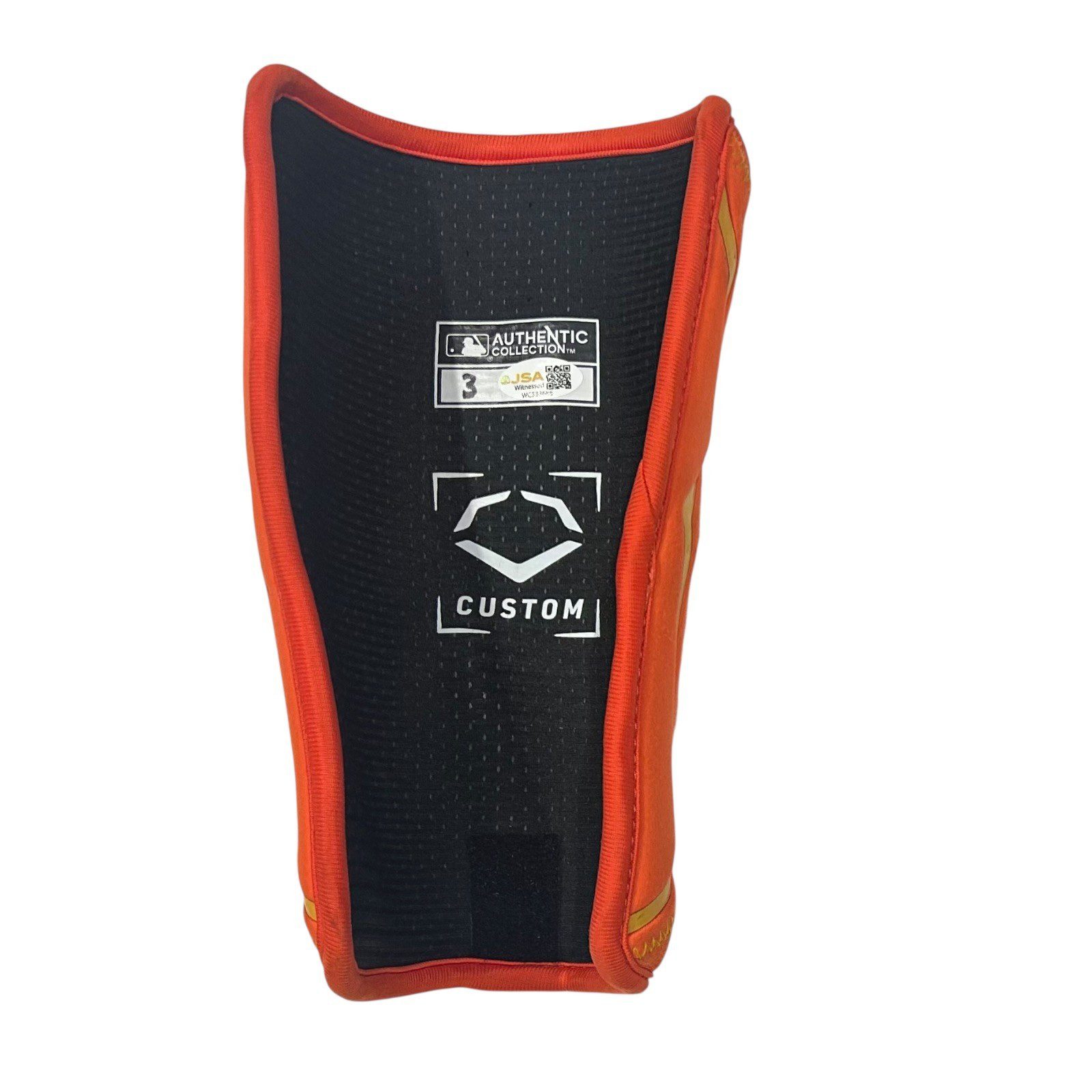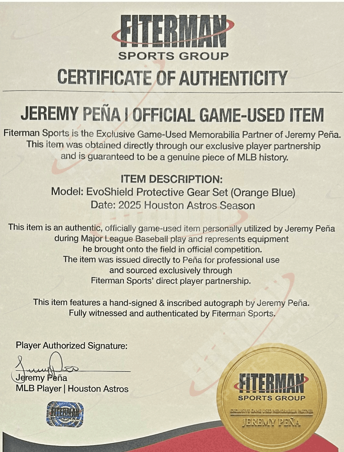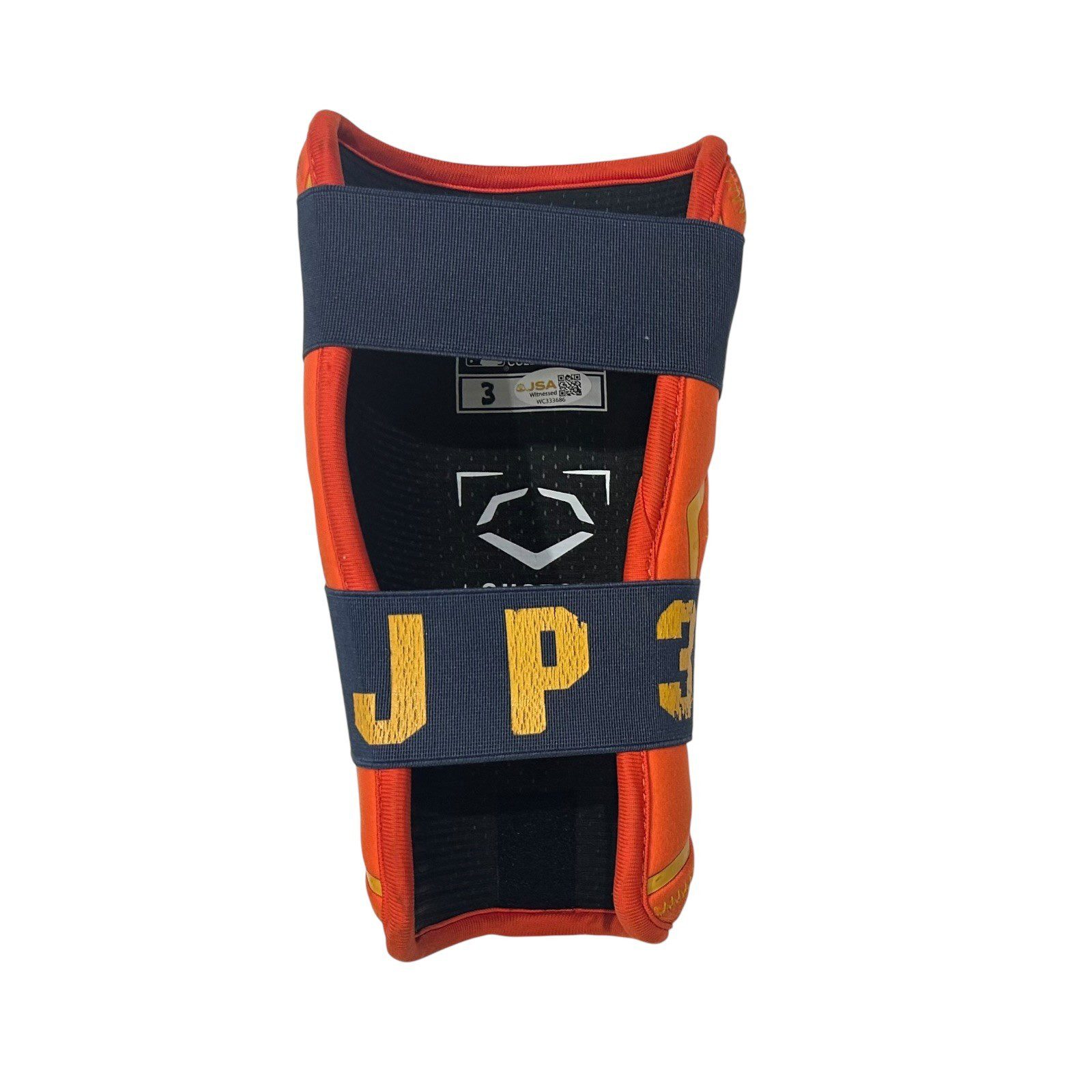 This is a game used elbow pad and shin guard used by Jeremy Pena in 2025. This elbow pad and shin guard was used by Mr. Pena during the 2025 MLB Season. These is items are custom made for Mr. Pena. This item comes with the inscription: 2025 Game Used. This item has JSA Authentication sticker, which comes with a JSA tamper proof sticker attached to the item. This items authentication can be viewed on the JSA website.