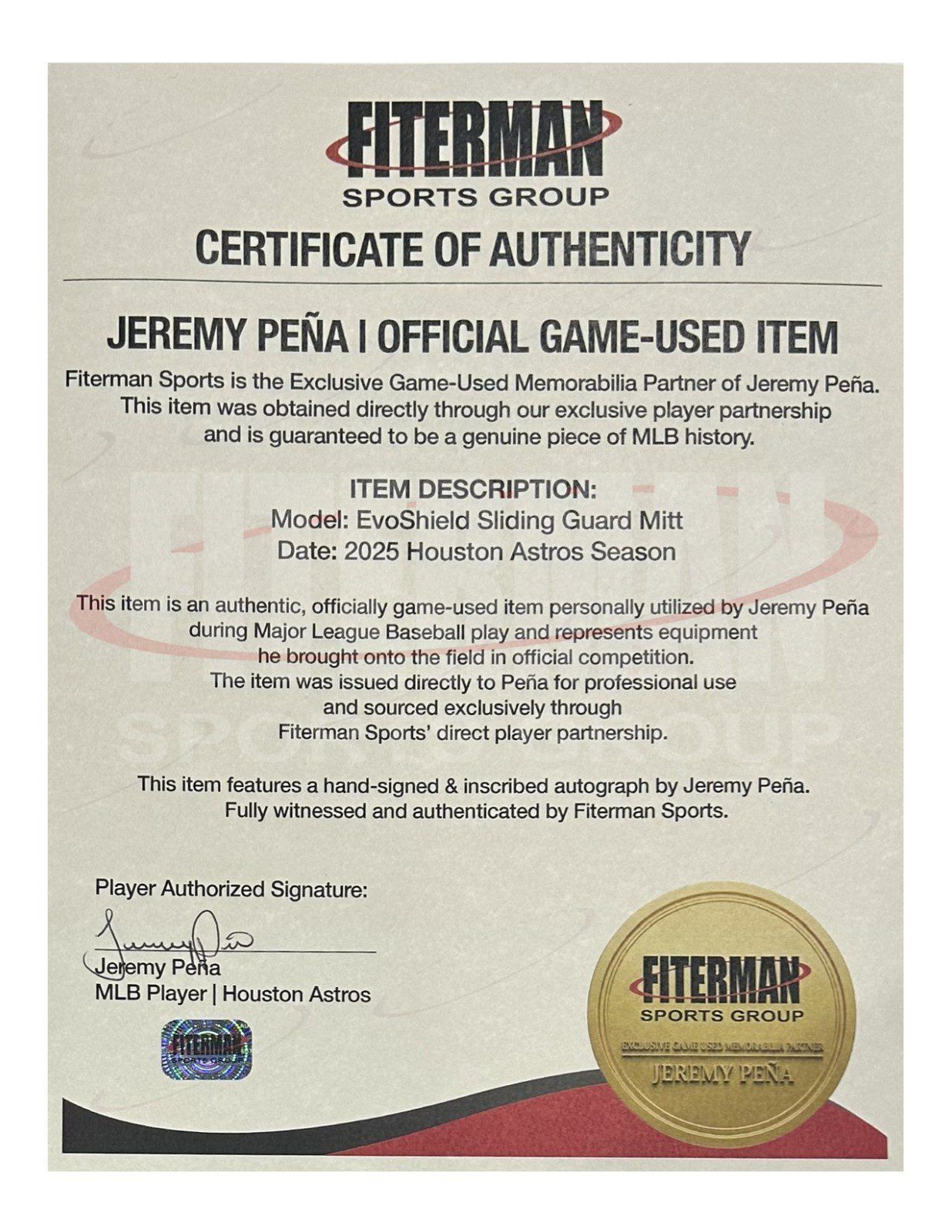 This is a game used sliding guard mitt used by Jeremy Pena in 2025. This sliding guard mitt was used by Mr. Pena during the 2025 MLB Season. This item is custom made for Mr. Pena for the 2025 All Star Game (HE DID NOT PLAY IN THE ALL STAR GAME). This item comes with the inscription: 2025 Game Used. This item has JSA Authentication sticker, which comes with a JSA tamper proof sticker attached to the item. This items authentication can be viewed on the JSA website.