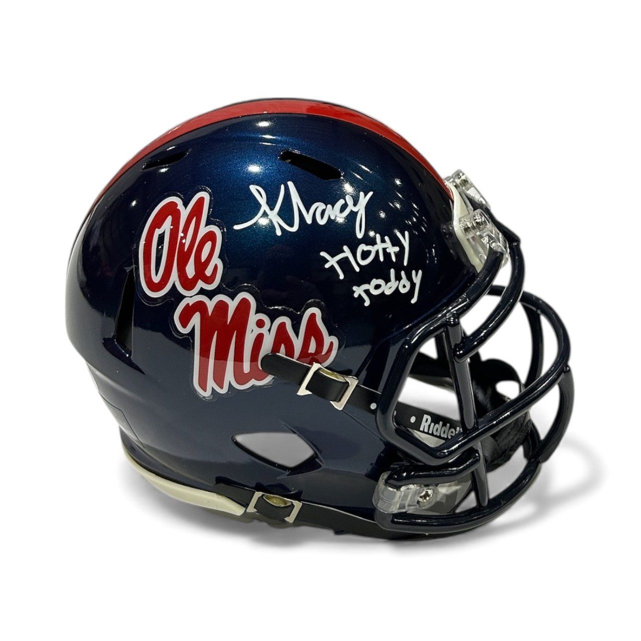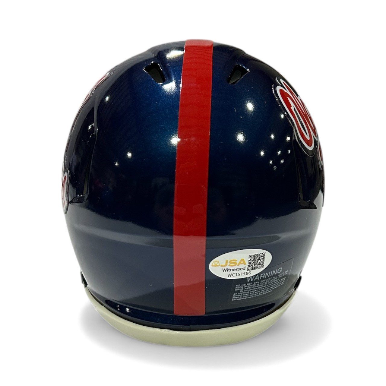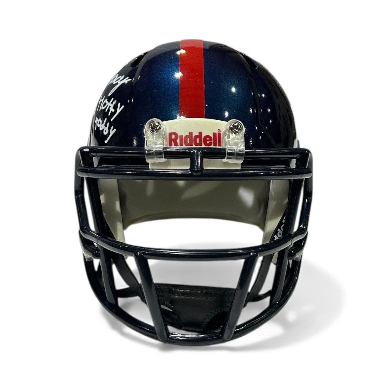 is a hand autographed helmet signed by the above mentioned player. This item comes with the inscription: Hotty Toddy. This is a Riddell Replica mini Football Helmet. This item has JSA