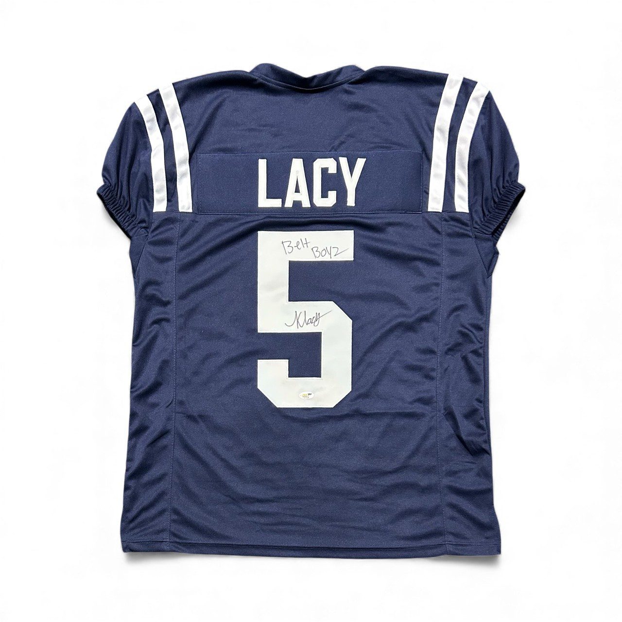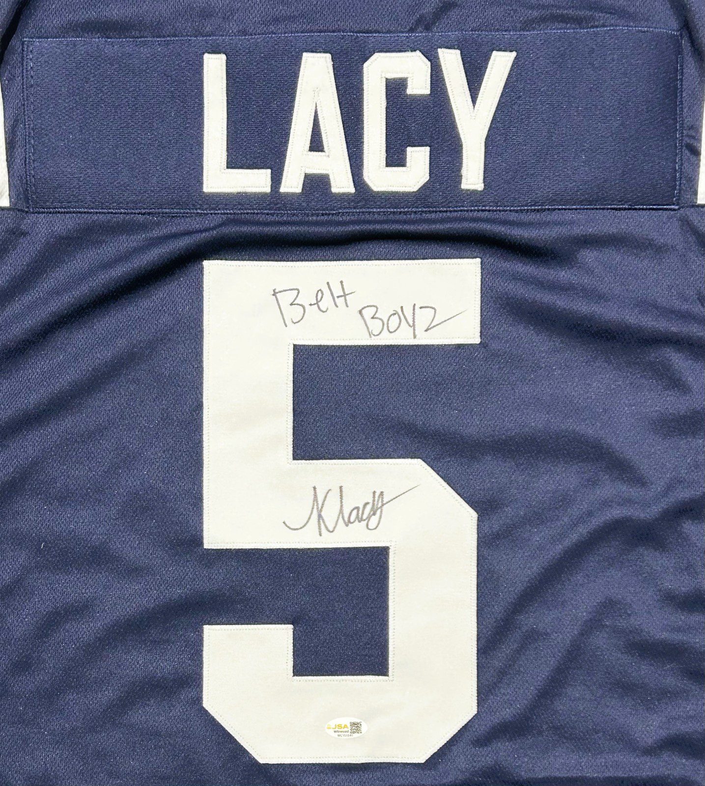 This is a hand autographed jersey signed by the person listed above. THIS IS NOT A NCAA JERSEY. THIS HAS NO TAGS, NO LOGOS, & NO EMBLEMS. This is a custom made; non name brand; authentic style jersey with all stitched letters and numbers. This jersey comes with the inscription: Belt Boyz. All jerseys are size XL and are brand new, never worn. This item has a JSA Authentication tamper proof sticker attached to the item. You can view this items authentication on the JSA website. All of our autographs are 100% Authentic.