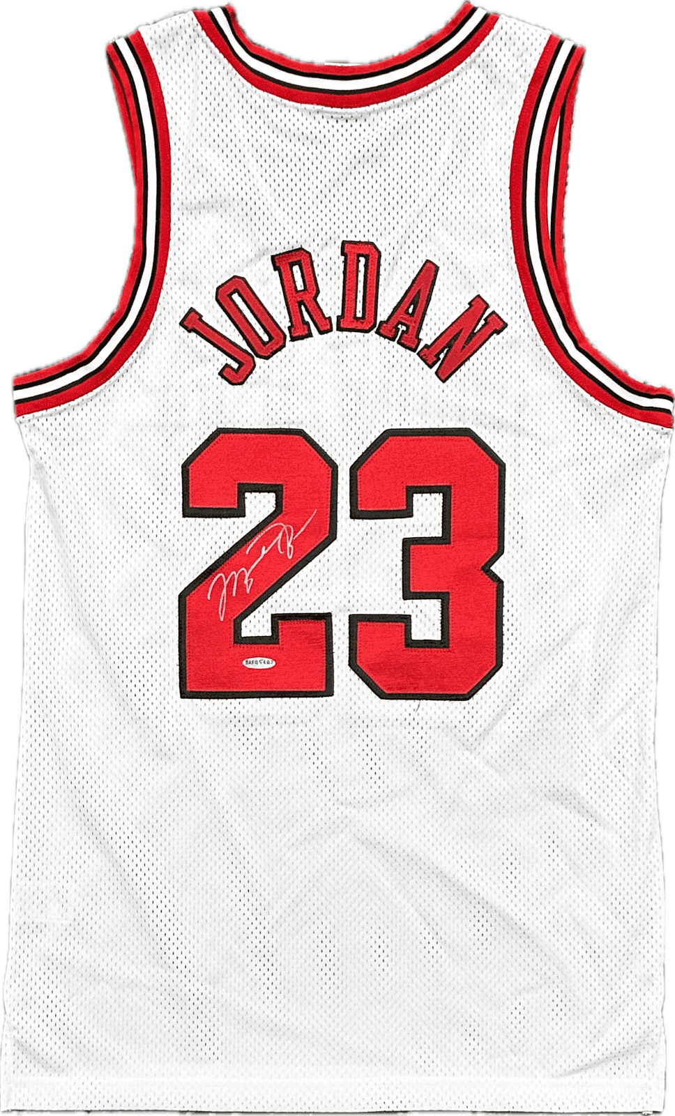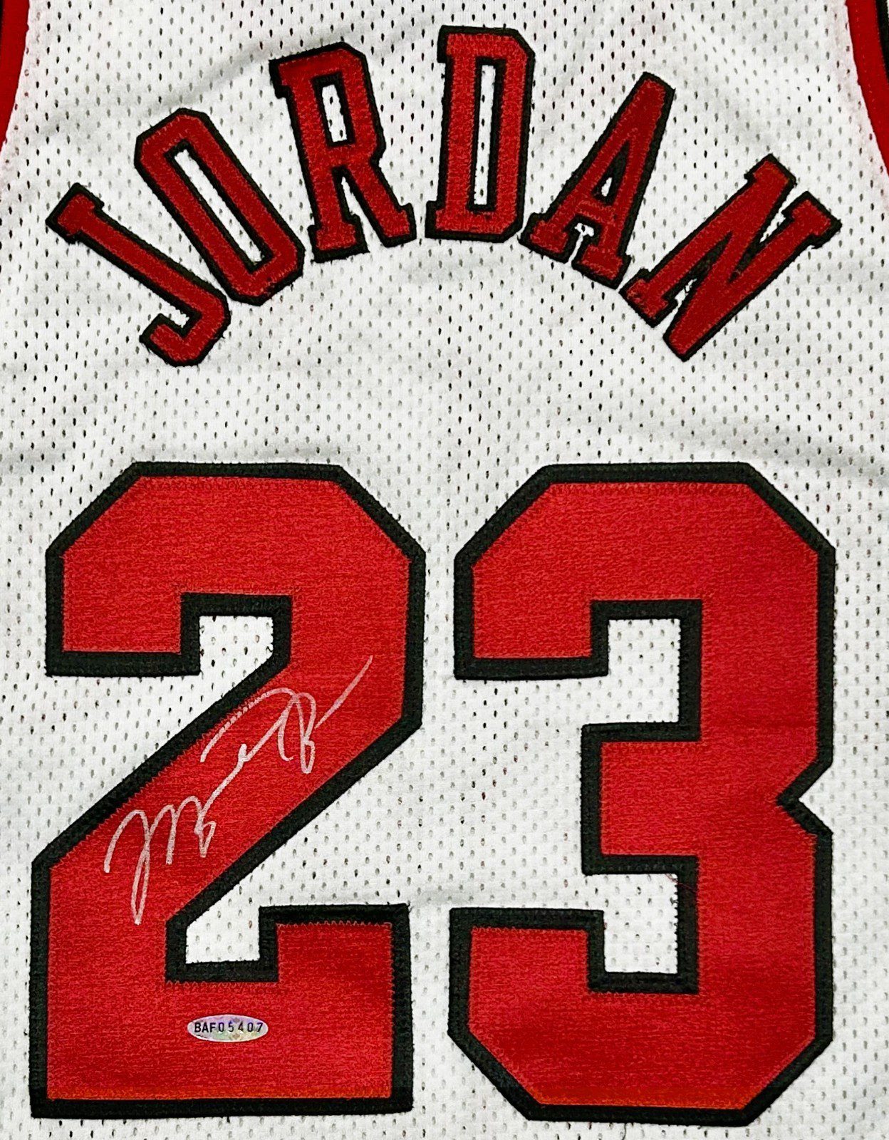 This is a hand autographed jersey signed by Michael Jordan. This is a Michael Jordan red Nike Chicago Bull jersey style. This jersey is a size 40. This item has a Upper Deck Authentication tamper proof sticker attached to the item. This item does not come with the matching Upper Deck COA. This item also comes authenticated with a Fuller Letter of authentication from GOAT Authentics. You can view this jerseys authentication on the GOAT Authentics website. (www.goat-authentics.com) All of our autographs are 100% Authentic.