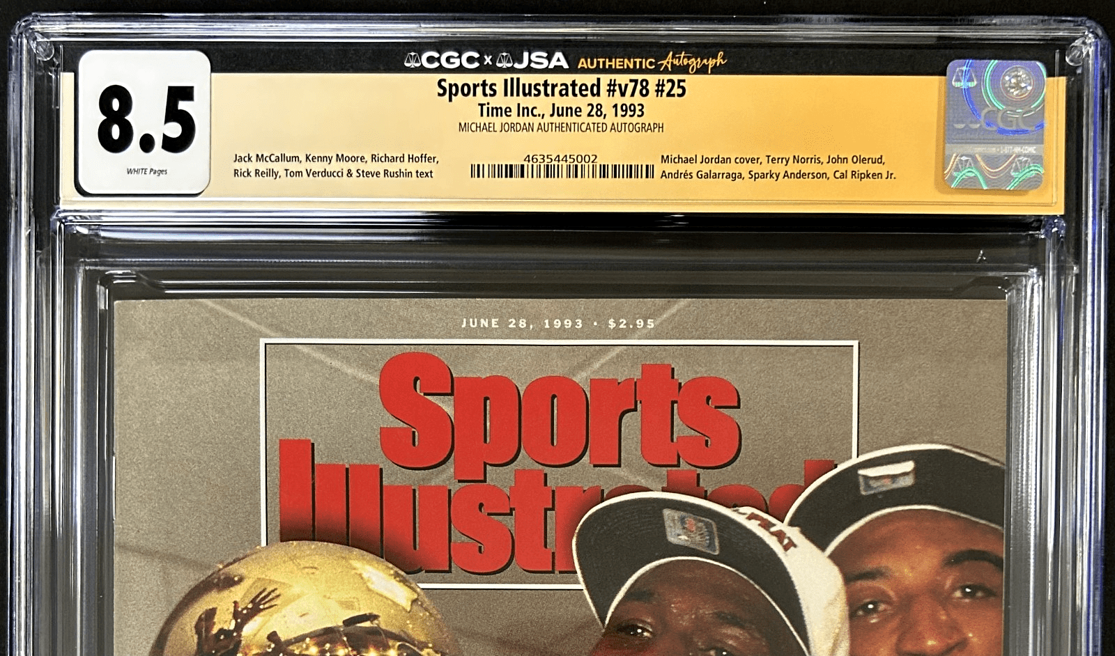 You are bidding on a graded CGC magazine. This is a Newsstand Edition Michael Jordan signed Sports Illustrated cover. It has been professionally graded by CGC at a 8.5 and autograph authenticated by JSA.