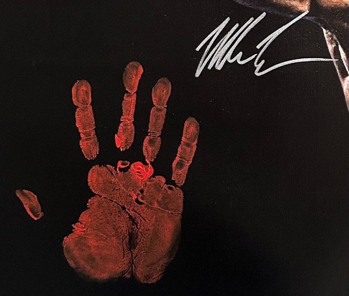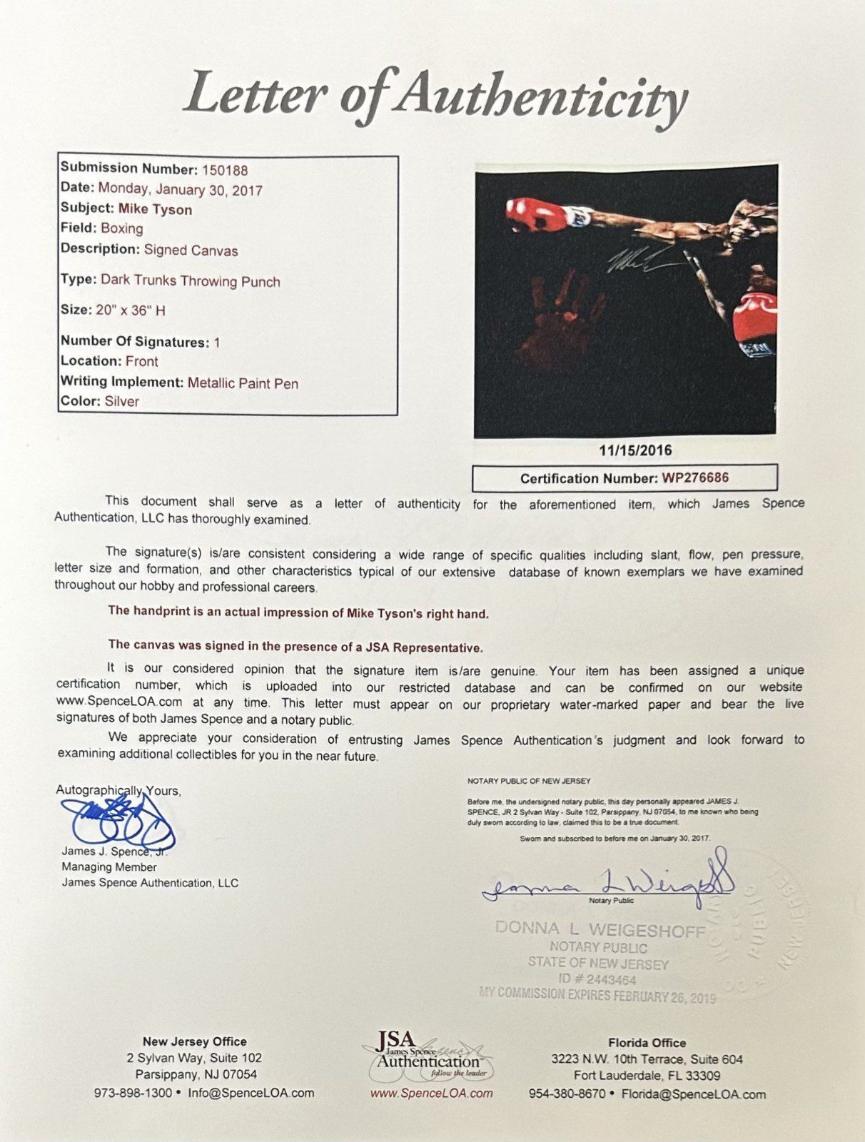 This is a brand new, hand printed and autographed unstretched 20×36 canvas piece, that has been signed and handprint by Mike Tyson.
