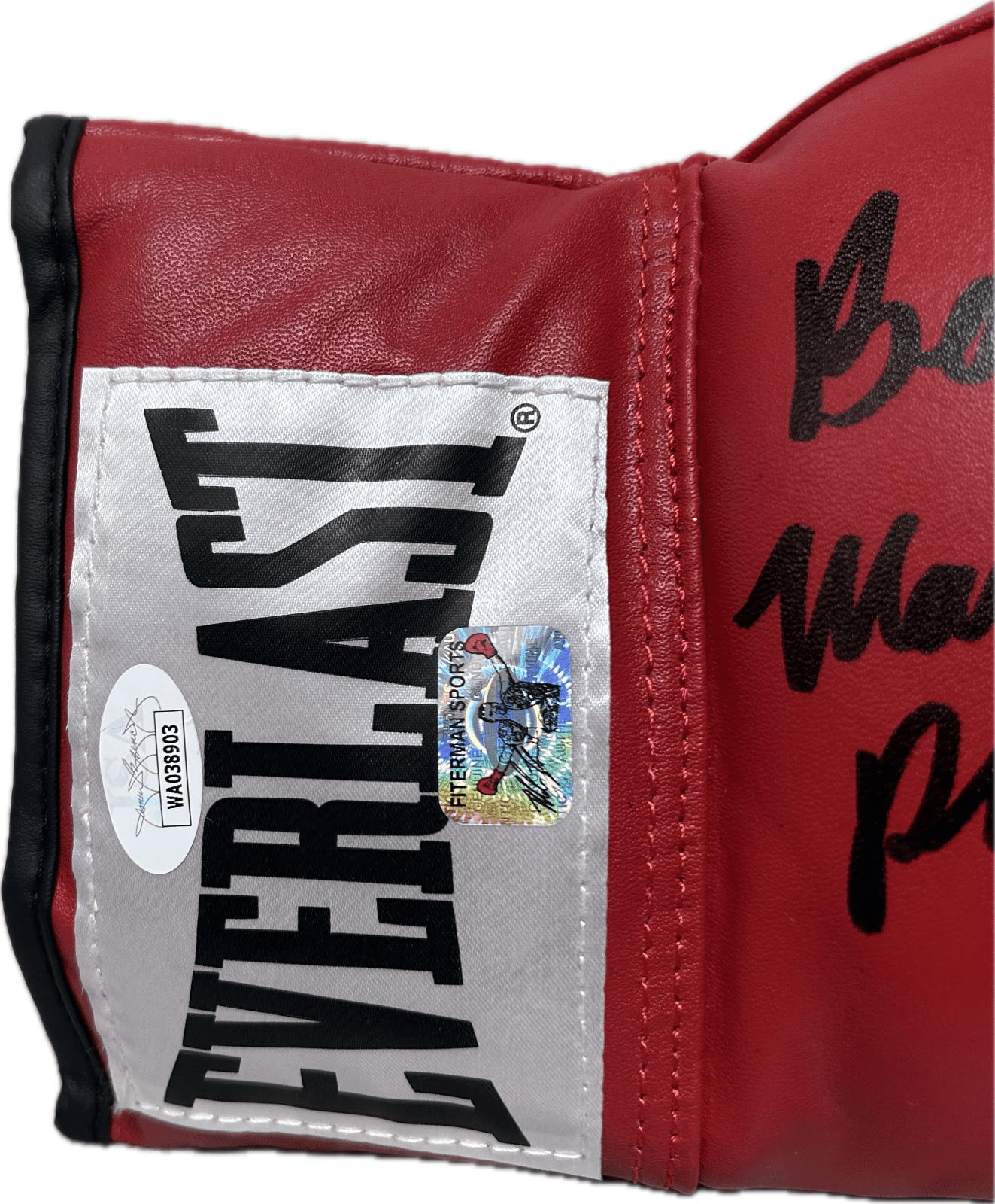 a red Right Leather Everlast Boxing Glove. This item has a James
