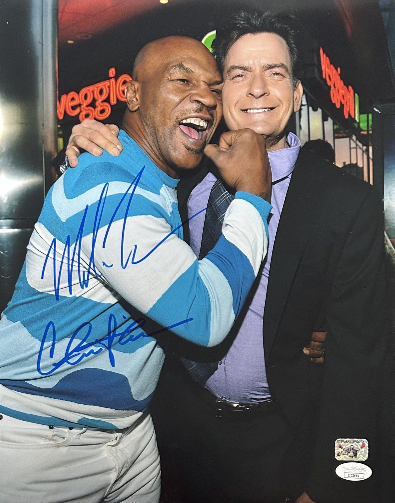 MIKE TYSON & CHARLIE SHEEN SIGNED 11×14 PHOTO JSA & TYSON AUTHENTICATION II03669