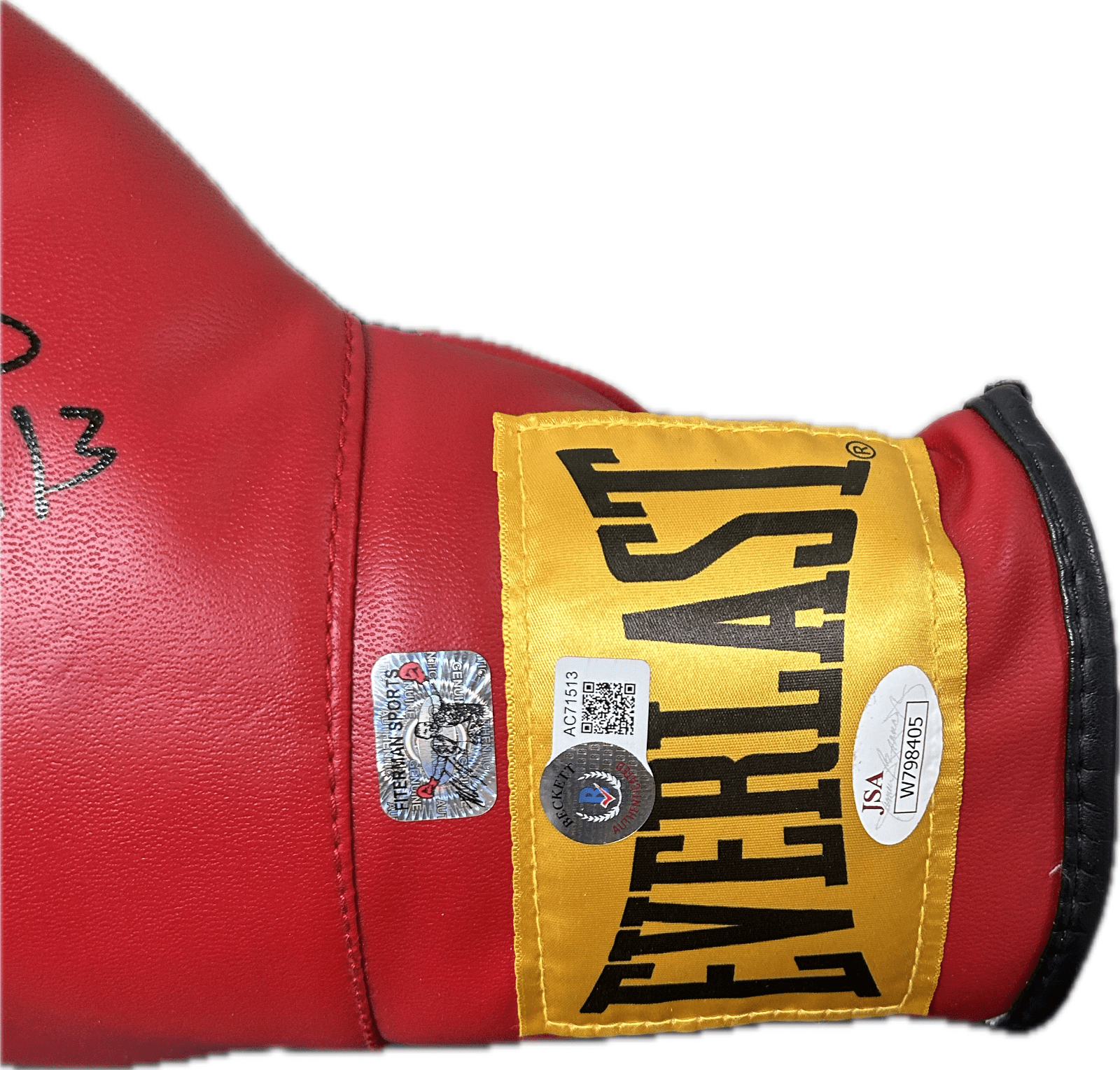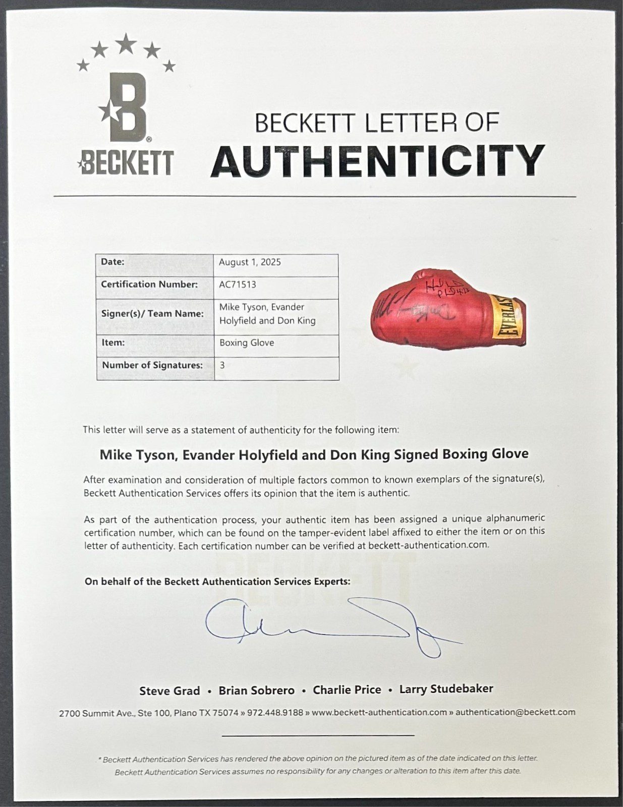 This is a hand autographed boxing glove signed by the persons listed above. This is aĀ RedĀ Everlast Boxing Glove.Ā This item has a Beckett Authentication for the Mike Tyson, Evander Holyfield & Don King autograph, which comes with a Beckett #’edĀ tamper proof sticker attached to the itemĀ and a Beckett Full Letter. You can view this items authenticationĀ on the Beckett website.Ā This item has a James SpenceĀ Authentication for the Mike Tyson autograph, which comes with a JSA #’edĀ tamper proof sticker attached to the itemĀ and a matching JSA certificate of authenticity card. You can view this items authenticationĀ on the JSA websiteĀ whichĀ shows when and where the item was signed. This item also comes with a Mike Tyson Exclusive hologram.Ā AllĀ of our items areĀ signed either at a public autograph appearance or a private signing. All of our autographs are 100% Authentic.Ā
