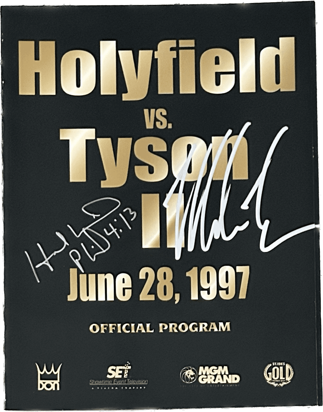 is a hand autographed program signed by the person listed above. This item has a James Spence Authentication tamper proof sticker attached to the item as well as matching COA card. This item also comes with a Mike Tyson exclusive hologram. All of our items are signed either at a