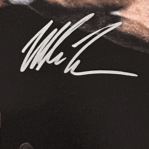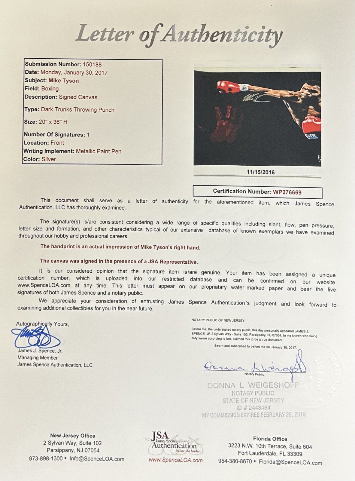 This is a brand new, hand printed and autographed unstretched 20×36 canvas piece, that has been signed and handprint by Mike Tyson.