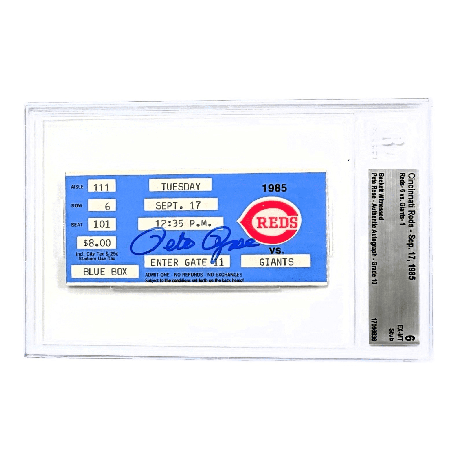 Be the first to review “PETE ROSE AUTOGRAPHED TICKET STUB 9/17/1985 BECKETT 6 EX-MT AUTO 10 17066836”
