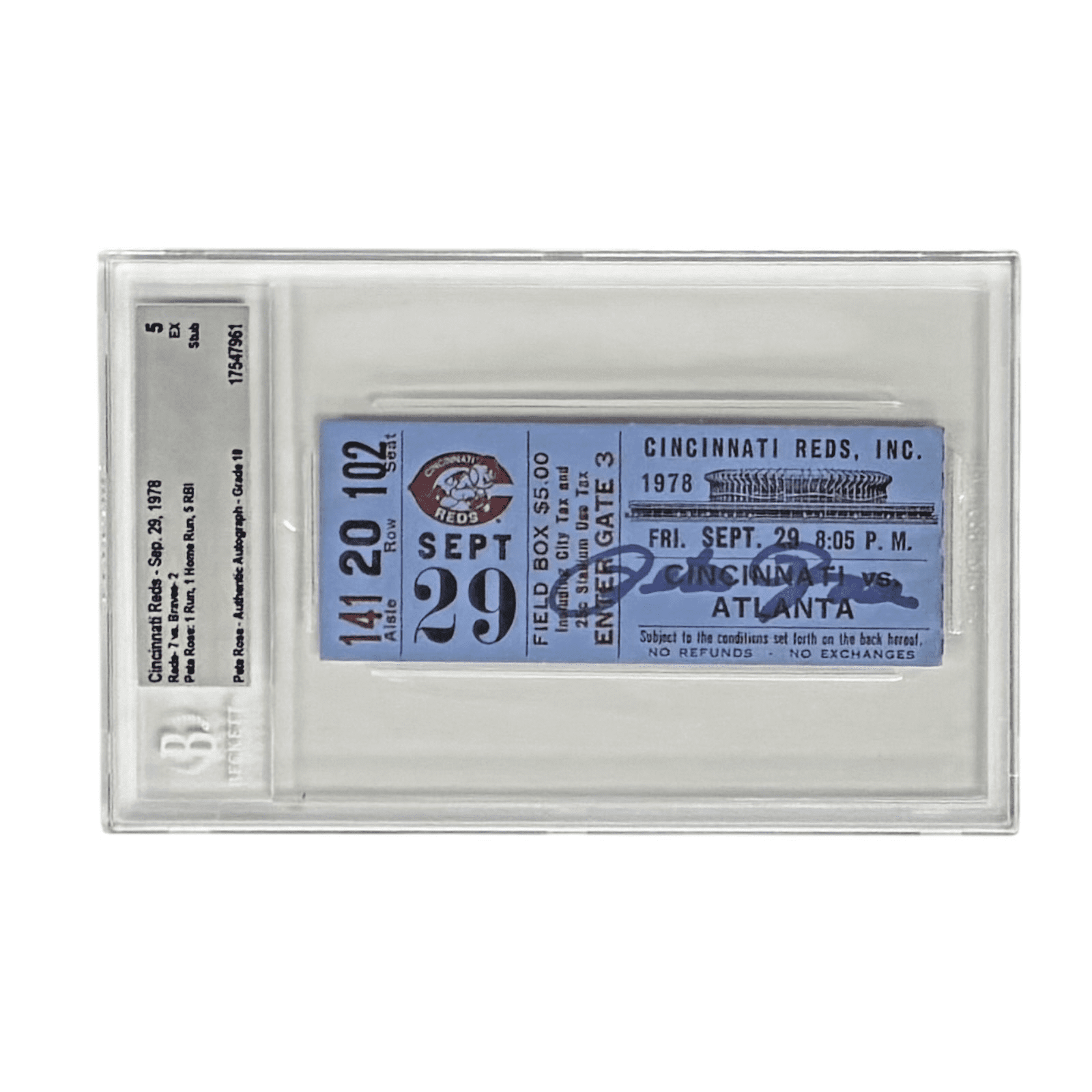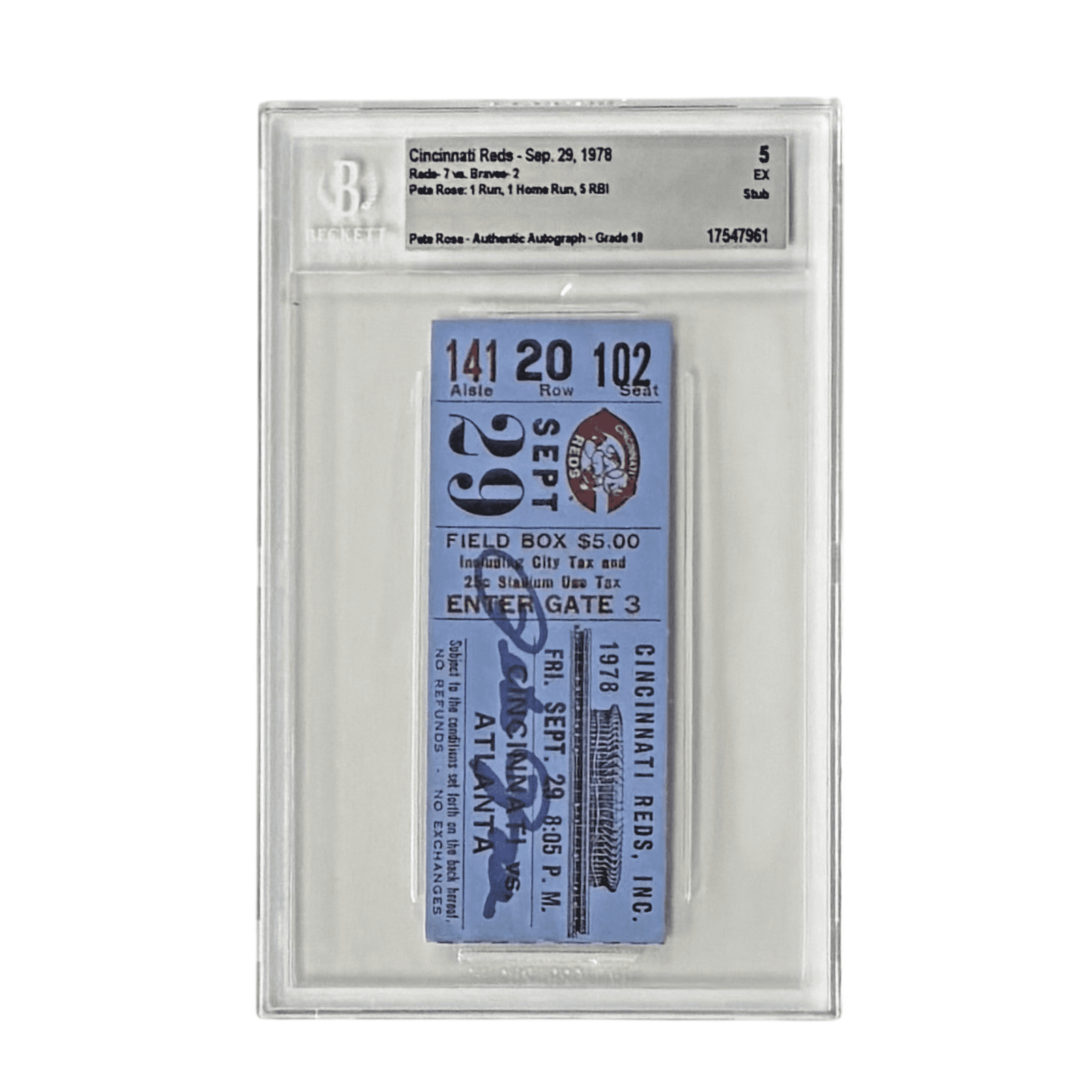 You are purchasing an autographed ticket signed by Pete Rose. This is a Ticket Stub is from the Cincinnati Reds vs the Atlanta Braves game held on September 29, 1978. This night Pete Rose had 1 run. 1 homerun and 5 RBIs.