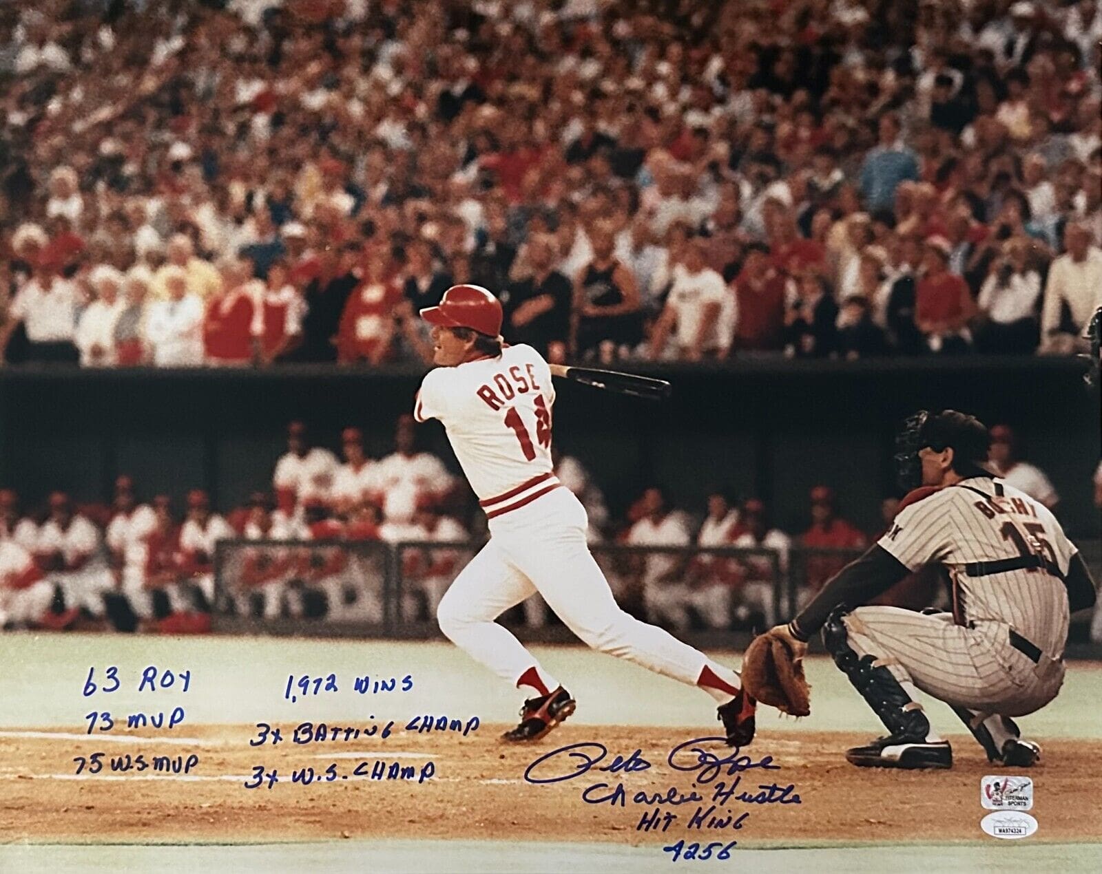 This is a hand autographed photo signed by the person listed above. This photo comes with the following inscriptions “Charlie Hustle, Hit King, 4256, 63 ROY, 73 MVP, 75 WS MVP, 1,972 Wins, 3x Batting Champ & 3x WS Champ.” This photo is 16 inches by 20 inches and is printed on the highest quality photo paper. This item has a JSA Authentication sticker, which comes with a JSA #’d tamper proof sticker attached to the item, also a JSA COA card as well. This item has a Pete Rose Player Exclusive Hologram attached to the item. All of our items are signed either at a public autograph appearance or a private signing. All of our autographs are 100% Authentic.
