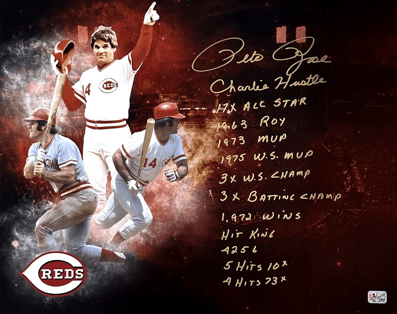 This is a hand autographed photo signed by the person listed above. This photo comes with the following inscriptions “Charlie Hustle, Hit King, 4256, 1963 ROY, 1973 MVP, 1975 WS MVP, 1,972 Wins, 3x Batting Champ, 3x WS Champ, 5 Hits 10x and 4 hits 73x.” This photo is 16 inches by 20 inches and is printed on the highest quality photo paper. This item has a Pete Rose Player Exclusive Hologram attached to the item. All of our items are signed either at a public autograph appearance or a private signing. All of our autographs are 100% Authentic.