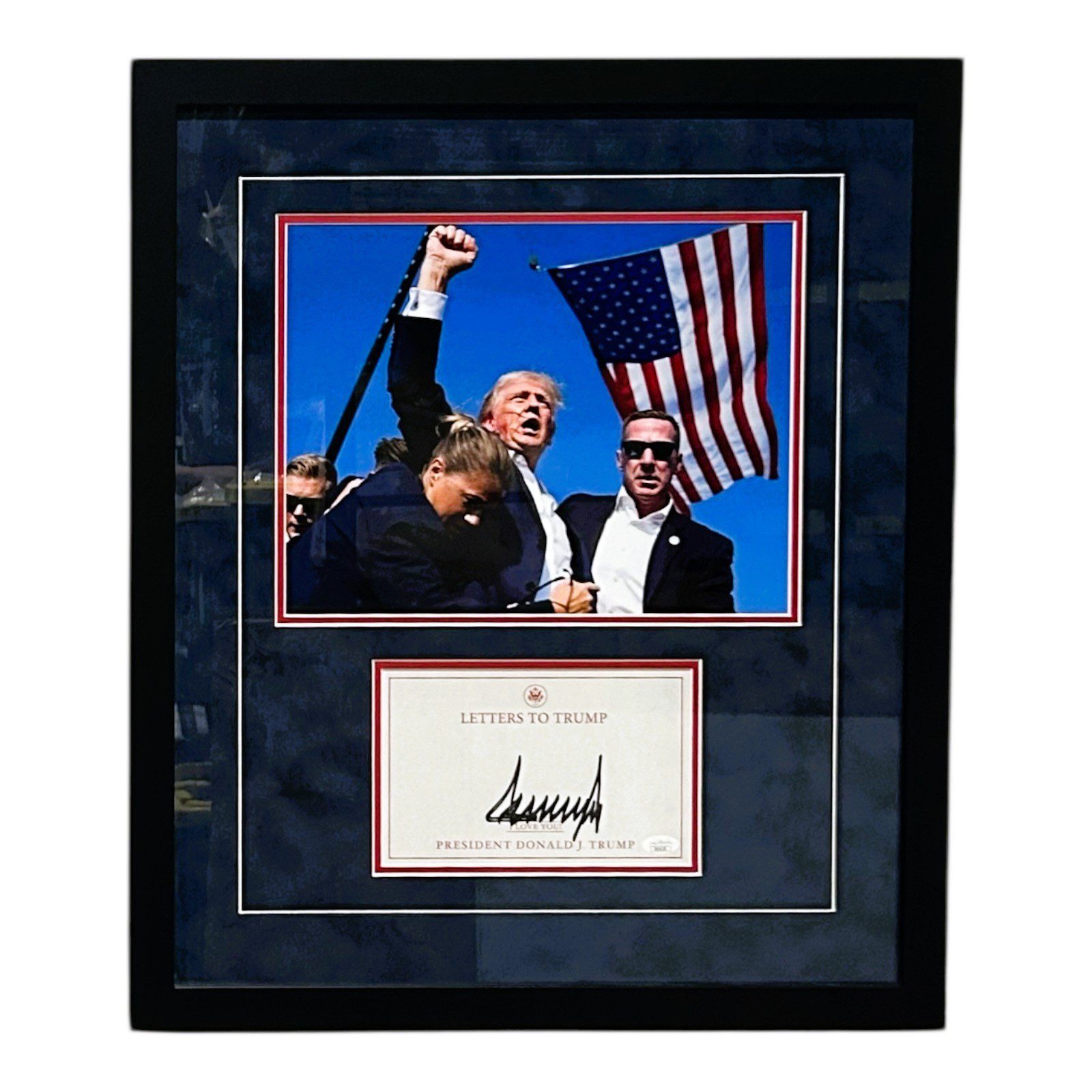 This is a hand autographed bookplate from the book Our Journey Together signed by President Donald Trump. This bookplate is 5.5 x 8.5 inches. The nameplate is framed with a 11×14 photo and the frame size is 22 1/2 x 26 1/2. This item has a JSA Full Letter Authentication, which comes with a JSA #’ed tamper proof sticker attached to the matching JSA certificate of authenticity Full Letter. You can view this items authentication on the JSA website. All of our autographs are 100% Authentic.