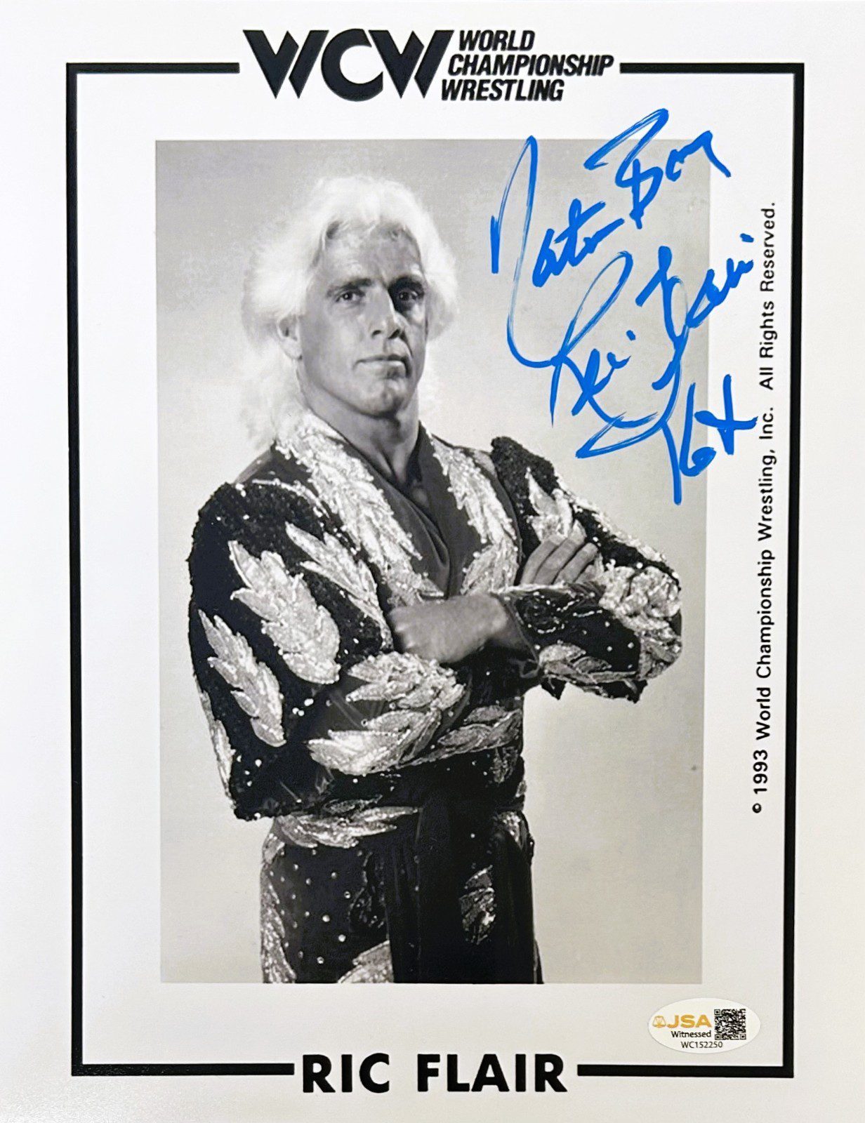 is a hand autographed photo by the person listed above. This item comes with the inscription: “Nature Boy & 16x”. This photo is 8 inches by 10 inches and is printed on the highest quality photo paper. This