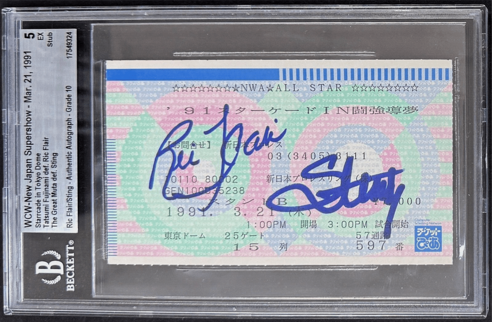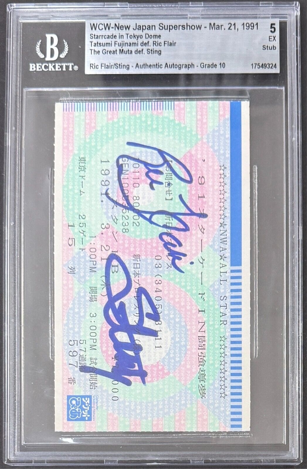 You are bidding on a autographed ticket signed by Ric Flair & STING. This is a ticket stub from the WCW/New Japan Super Show 1991 Starrcade event held at The Tokyo Dome on March 21st 1991. In these matches Ric Flair was defeated by Tatsumi Fujinami and Sting was defeated by The Great Muta.