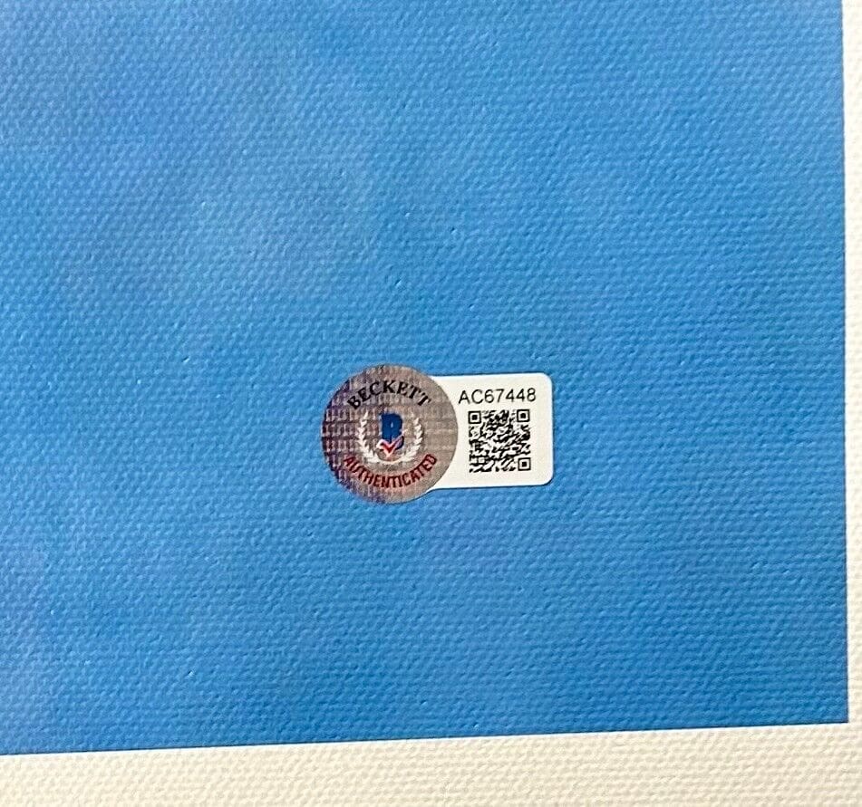 This is a hand autographed canvas by the person listed above. This is an unstretched canvas and it measures 24×36 and the frame measures 31 1/2 X 42 1/2. This item has a Beckett Authentication tamper proof sticker attached to the item. You can view this items authentication on the Beckett website. All of our items are signed either at a public autograph appearance or a private signing. All of our autographs are 100% Authentic.