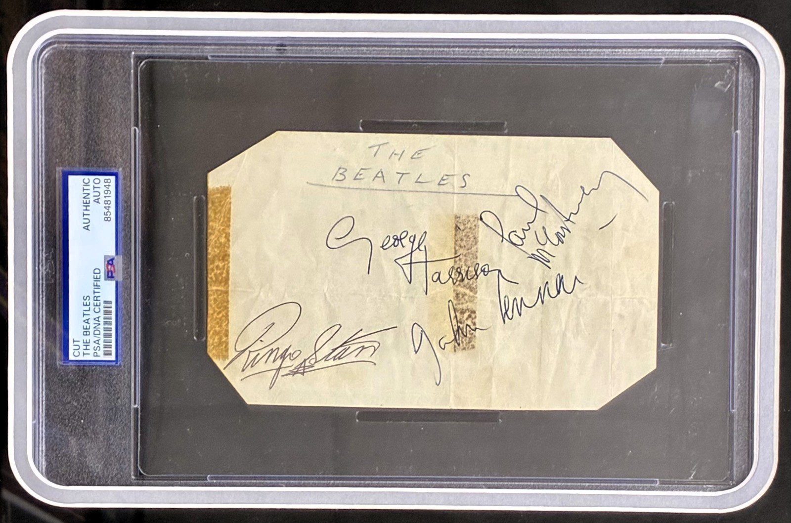 This is a hand autographed framed slabbed cut signed by The Beatles. Signed by John Lennon, Paul McCartney, George Harrison and Ringo Starr. The measurements of the frame are 32 1/2 x 30 1/2. This item comes slabbed by PSA. You can view this items authentication on the PSA website. All of our autographs are 100% Authentic.
