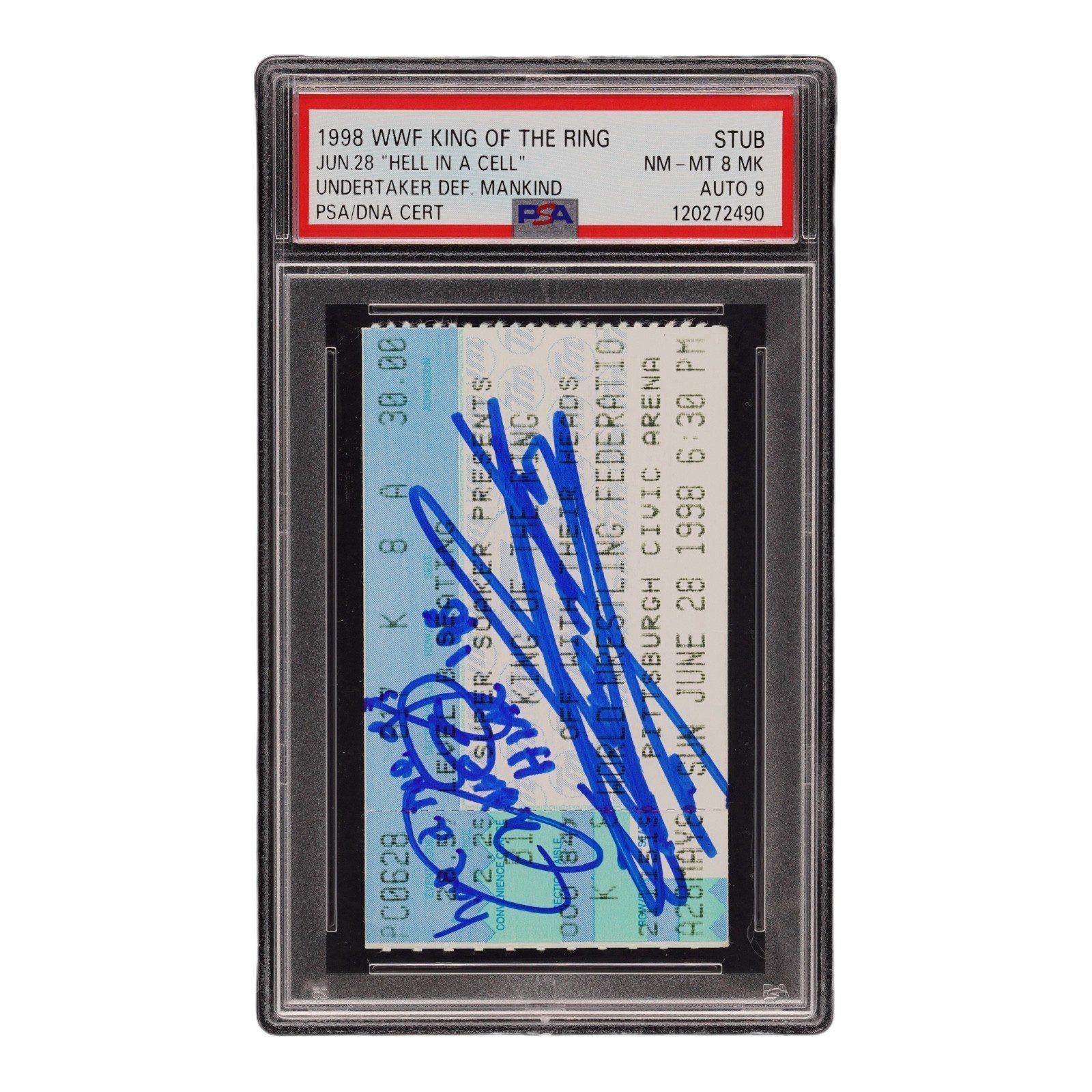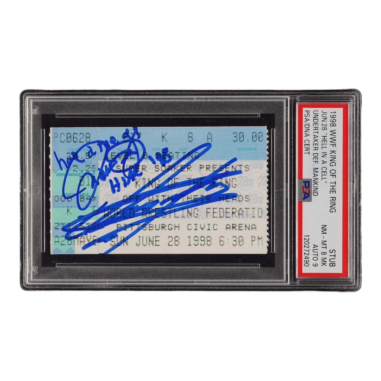You are bidding on a autographed ticket signed by Undertaker and Mankind. This is a ticket stub from The 1998 WWF King of The Ring Hell In A Cell. This item comes with the inscriptions from Mankind: Have a nice day and HIAC ’98.