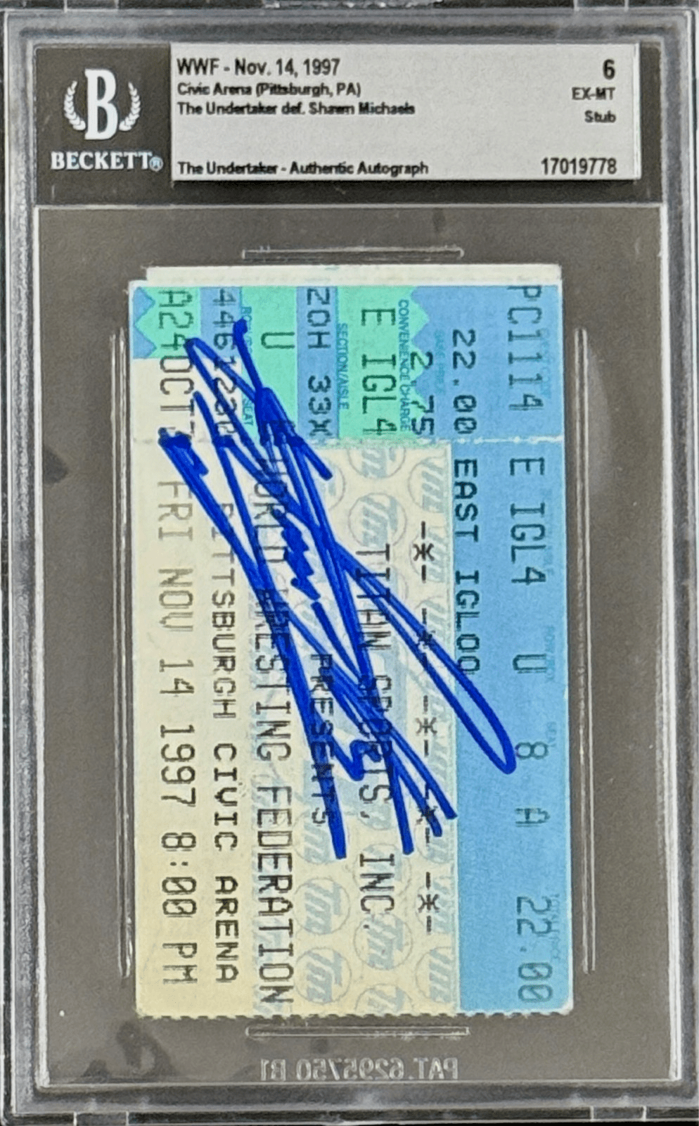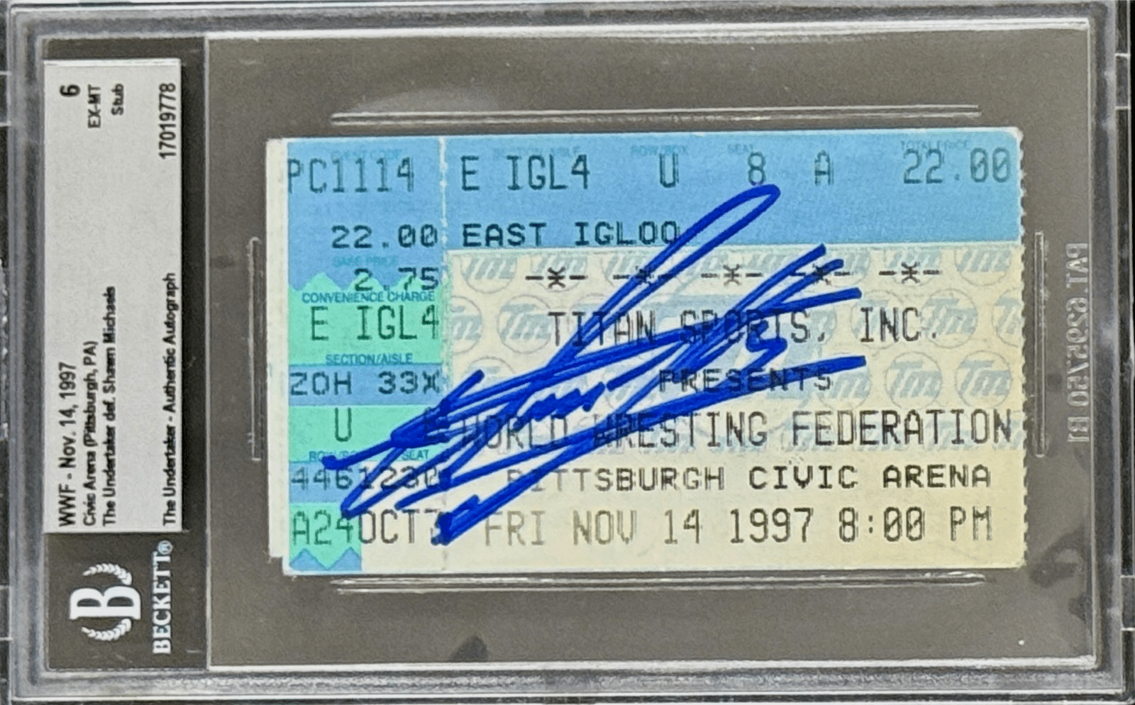 You are bidding on a autographed ticket signed by Undertaker. This is a ticket stub from March 21, 1998. This event took place at The Civic Center. The The Undertaker defeated Shawn Michaels.