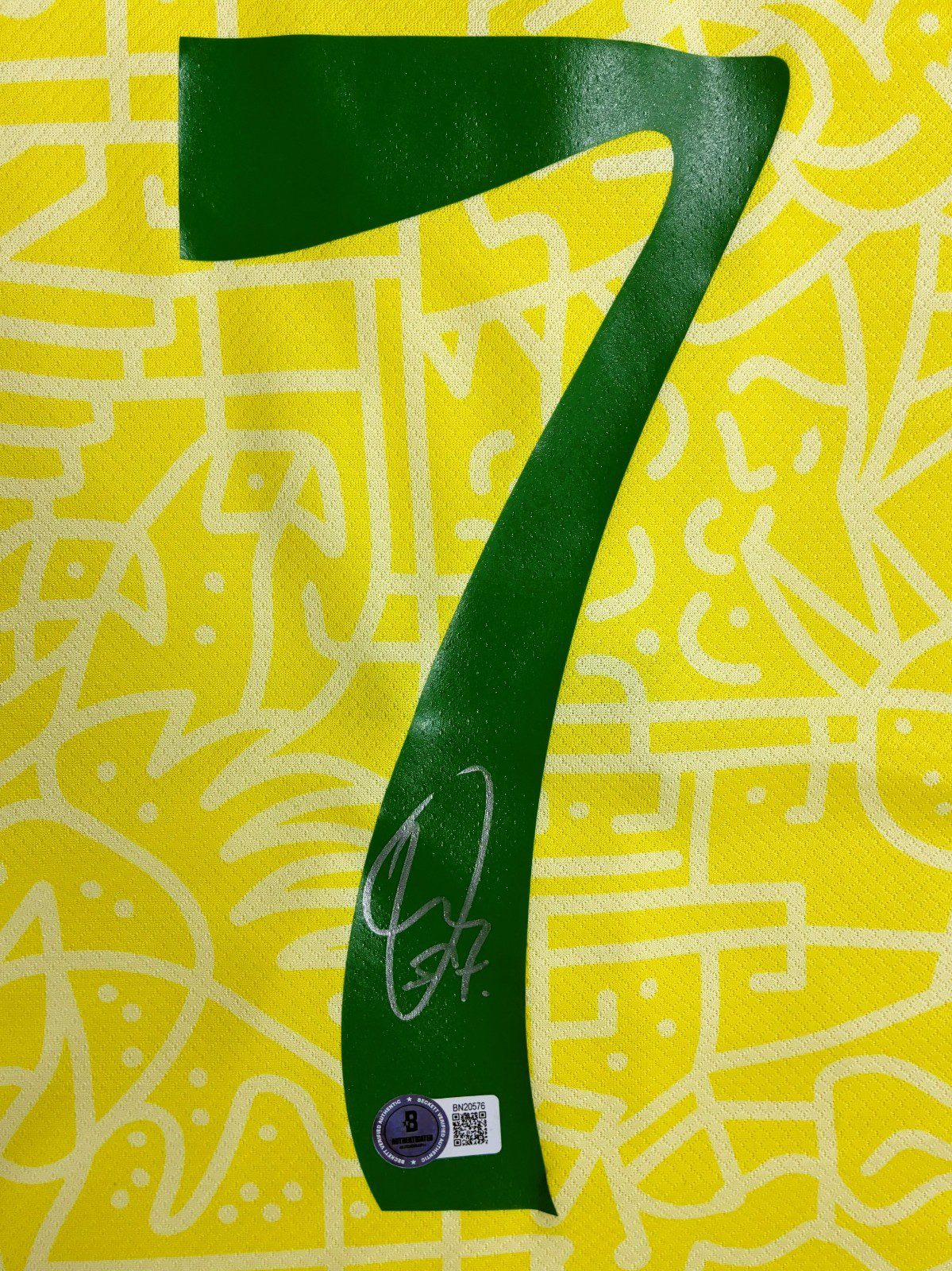 is a hand autographed jersey signed by the person listed above. This is a Brazil Jersey . This jersey is size Large and is brand new, never worn. This item has a Beckett tamper proof sticker attached to the item. You can view this item authentication on the Beckett website. All of our autographs